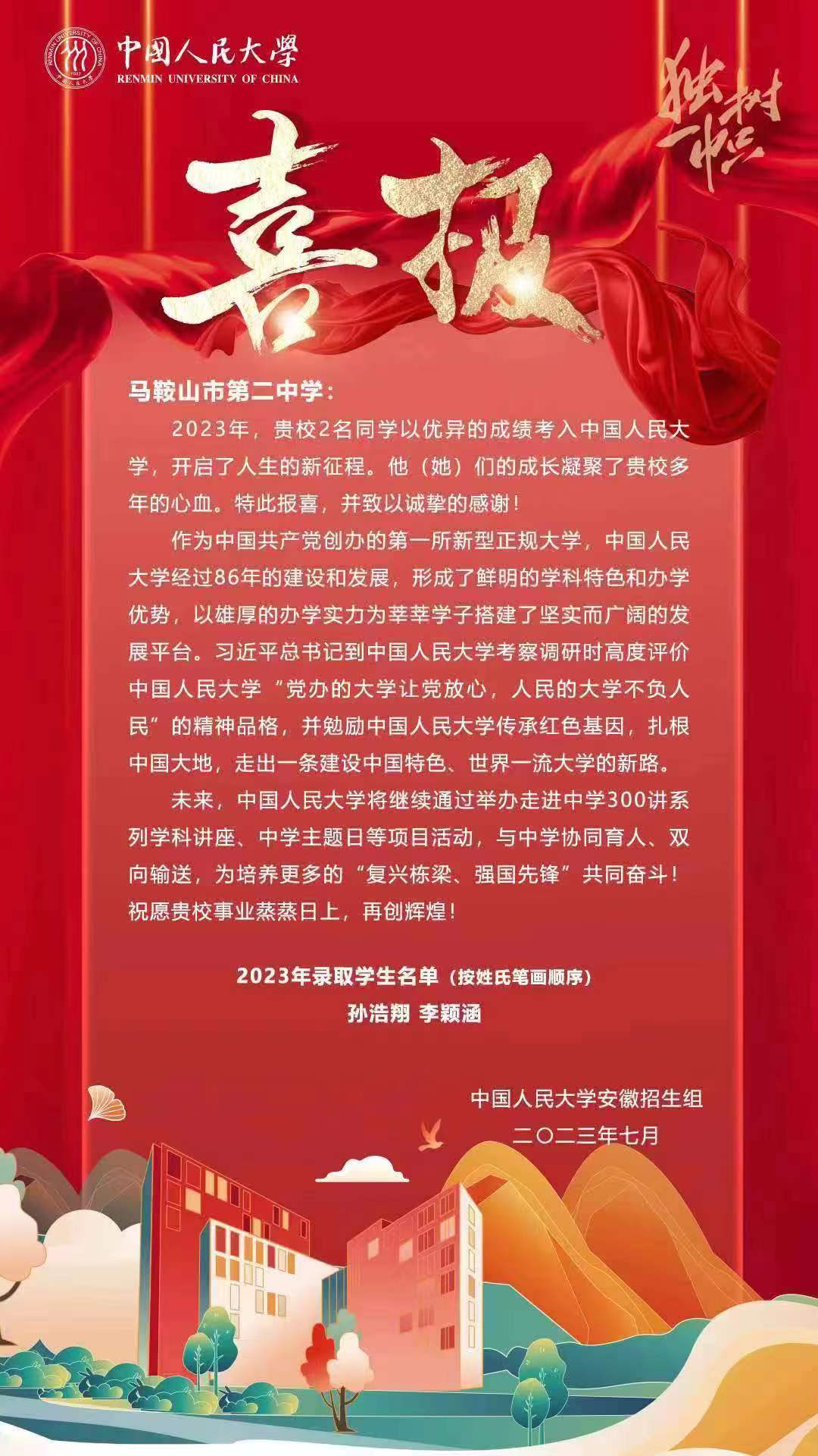 中(zhōng)國人(rén)民大學向我校發來喜報