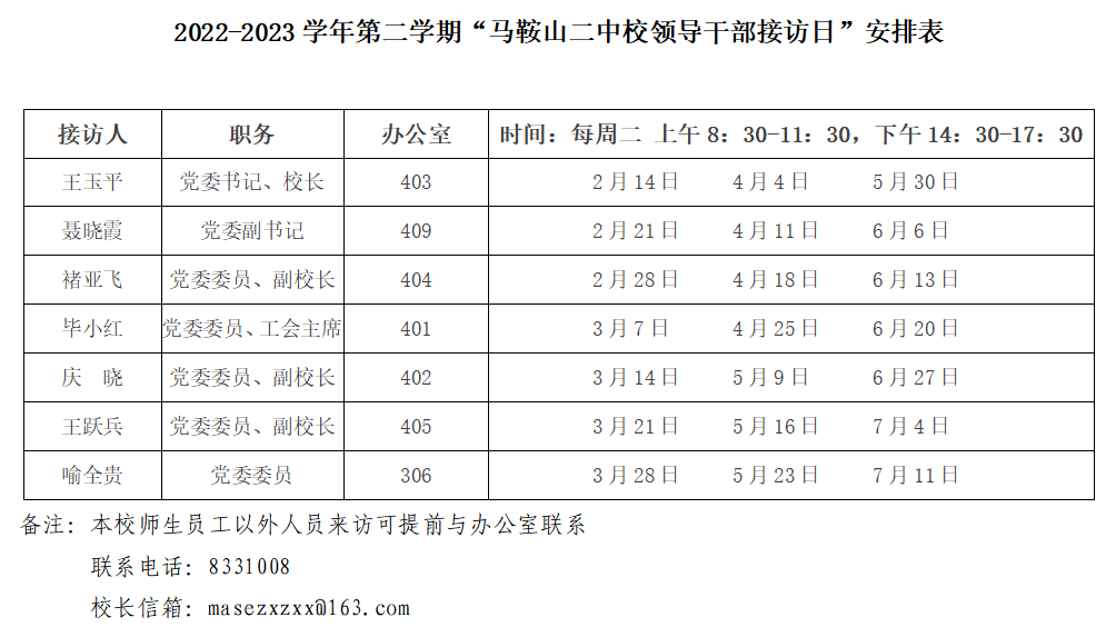 2022-2023學年第二學期“馬鞍山二中校領導幹部接訪日”安排(pái)表