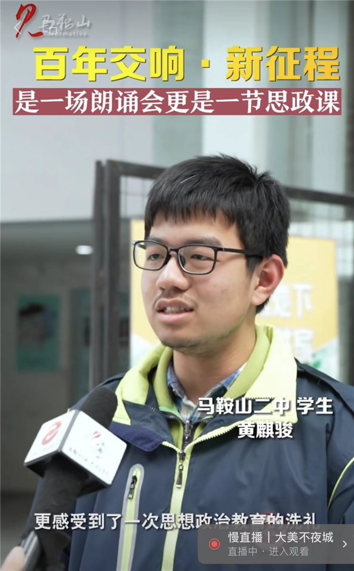 活(huó)動結束之後,馬鞍山廣播電視台的記者對高二(15)班的兩位同學進(jìn)行了采訪(fǎng),黃麒駿同學說道:“聆聽了(le)這場朗誦會,不隻(zhī)是藝術的欣賞,更感受到了(le)一次(cì)思想政治教育的洗禮。”孫紫晗同學表示:“作為當代青(qīng)年,91视频网站(men)應以非誌無以成學的勁頭,利用思(sī)政課提高思辨(biàn)能力,刻苦(kǔ)學習,努(nǔ)力實踐。”