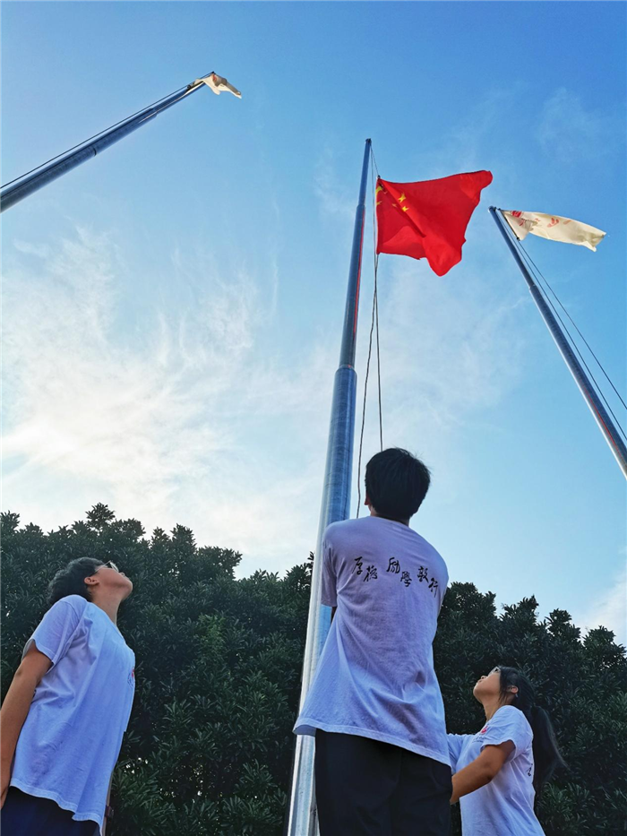 在(zài)高一(11)班陳(chén)嘉琪同學的(de)主持下,三位升旗手迎著朝陽升起國旗,全體師生奏唱國歌。