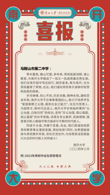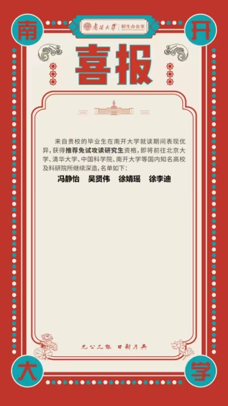 您現在的位置:首頁 - 新聞中心 - 校園新聞 - 南開大學發來喜報