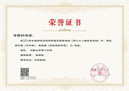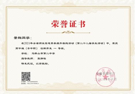 近日(rì),在2024年全省師生信(xìn)息素養提升實踐活動(第二十二屆學生活動(dòng))中,馬鞍山市第二中學的學子以卓越的表現,取得(dé)了令人矚目(mù)的成績。高一(yī)(13)班的景翔和高一(5)班(bān)的甘奕軒表現突出,榮獲佳績。