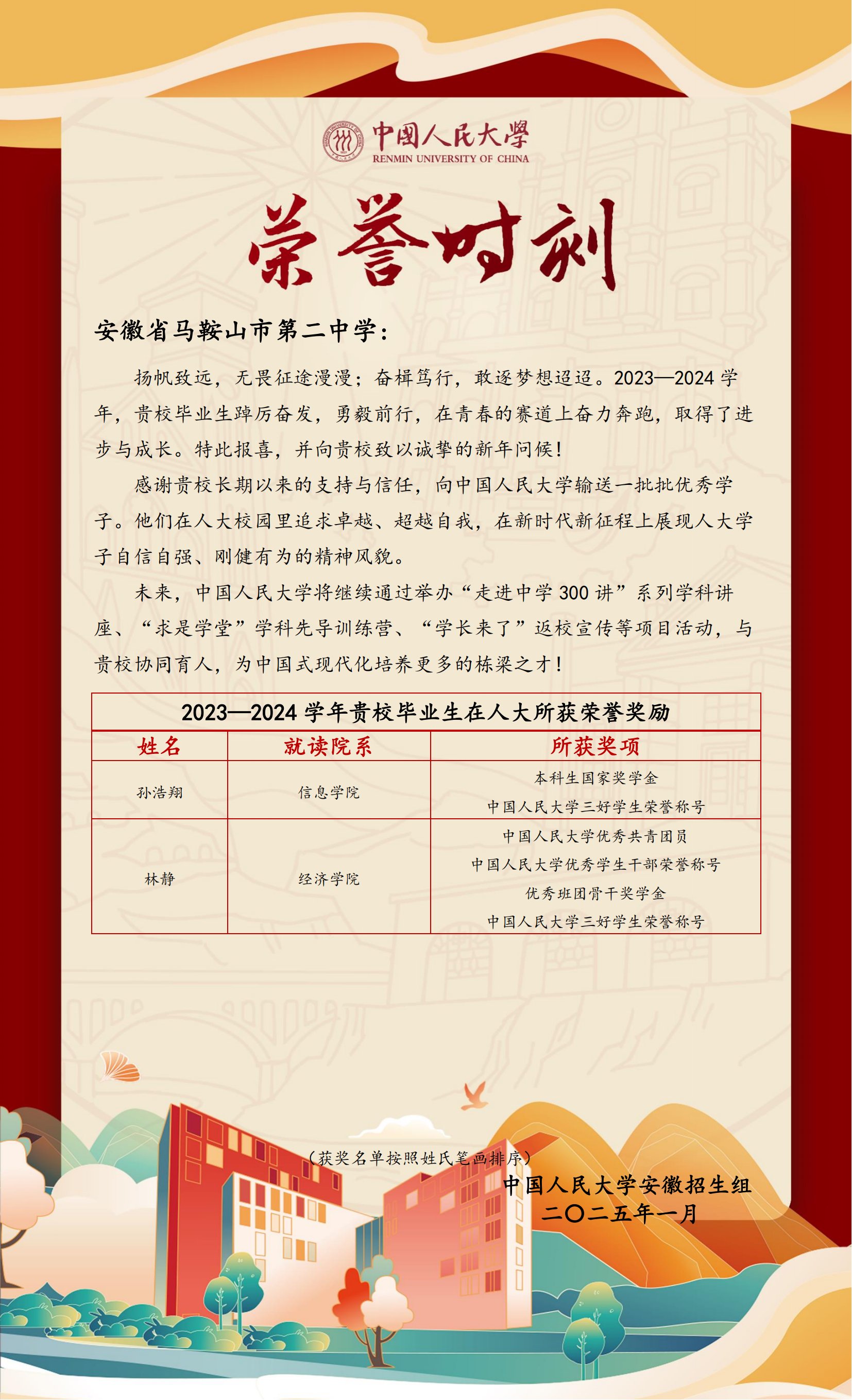 中(zhōng)國人民(mín)大學向我(wǒ)校發來(lái)喜報
