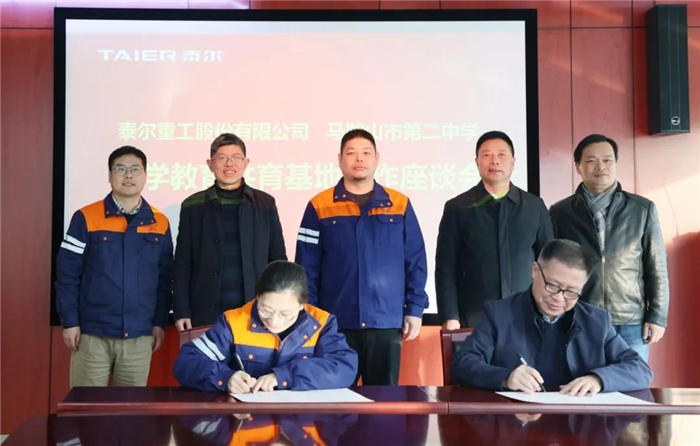 校企合作,拓寬科學教育實踐平台。1月21日下午,馬鞍山(shān)市(shì)二中原校長郭惠(huì)宇,二中黨委書記王東山,二中黨委副書記、校長王玉平,二中黨委(wěi)委員、副校長孫濱一行到訪泰爾參(cān)觀(guān)座談。泰爾黨委書記、董事長邰紫鵬、泰爾副總經理吳世祥、董吳霞陪(péi)同參觀並參(cān)加座(zuò)談。座(zuò)談會後,泰爾(ěr)重工、馬鞍山市二中“科學教育共育基地”簽約儀式正式(shì)舉(jǔ)行。此(cǐ)次簽約(yuē)促進了企業與學(xué)校之間的(de)深度合作,雙方將攜手推動科學教育(yù)事業的提升。