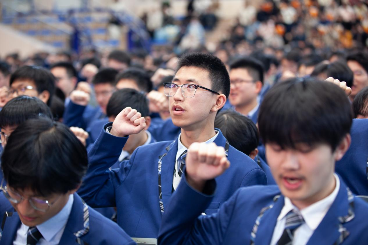 心懷家國方能行穩致(zhì)遠(yuǎn),腳踏實地終能勇攀高峰。當傾注科任老師美好祝願的短片在大(dà)屏展開,也(yě)將滿滿的(de)期許鄭重交付。“金聲勵誌(zhì)”環節掀起典禮高潮(cháo),同學們握拳齊眉,誓言(yán)鏗(kēng)鏘,有“我命由我不由天”的高聲呐喊,也(yě)有“舍我誰與爭鋒”的豪情(qíng)萬丈(zhàng)。20個班級,口號聲響震屋(wū)瓦,聲浪如潮水般此起彼伏。各具特色的宣(xuān)誓儀式,展現出他們無畏挑戰、勇往直前的堅定勇氣。304班吳琪嘉同學領誓,讓錚錚誓言穿透穹頂,在每個人心中刻下永不褪色的擔當印記。