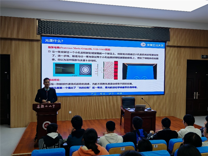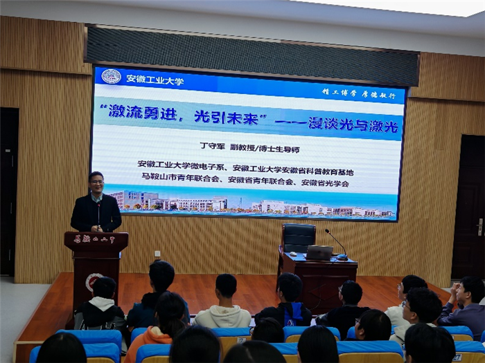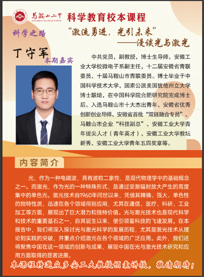 繼“科學教育進校園”係列課程首講(jiǎng)收獲熱烈反響後,馬鞍山二中於(yú)近期再度(dù)為學子們搭建起接觸(chù)前沿科技的(de)橋(qiáo)梁。本次活動特邀安徽工業大學校微電子係副主任(rèn)丁守軍副教授主講,以“激流勇進,光(guāng)引未來”——漫談光與激光為主題,帶領同學們走(zǒu)進光與(yǔ)激光的(de)奇妙世界,開啟一場兼具科學性(xìng)與趣味(wèi)性的探索之(zhī)旅。