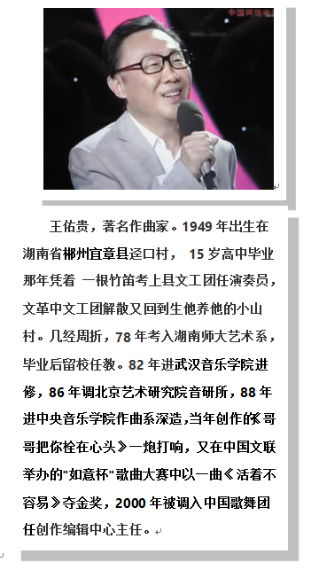 1、上述的作曲家王佑貴, 是共(gòng)和國的同齡(líng)人。他與共和國一路走來,可以說建國以來國家所發生的許多大事都目睹了或經曆了,正是這些“留意的目睹”,“用心的經曆”和 “深切的體悟”,驅使他更加懂得“珍惜人生”,更加明(míng)白“感恩社會”的道理(lǐ)。因此,才能寫出、譜成並(bìng)唱好自己與共和國同行的“真”與“美”!