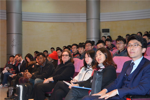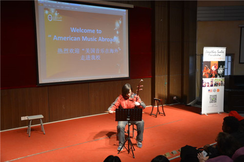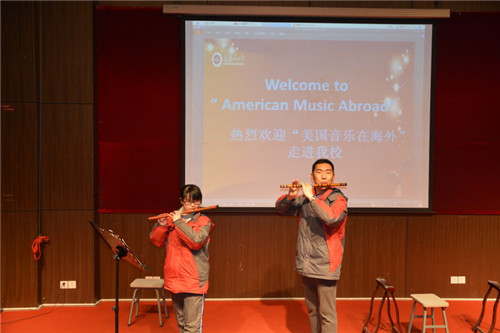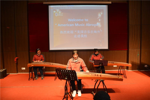在音樂交流階段,首先由(yóu)二中學生(shēng)進行中國傳統(tǒng)樂器表演,學生的表演十分投入,將古箏(zhēng)的淡雅,二胡(hú)的悠揚,竹笛的靈動演繹得淋漓盡致,贏(yíng)得了在場嘉賓和同學們(men)的(de)陣陣掌聲。之後,“美國音樂在海外”樂團現場(chǎng)即興演奏爵士(shì)樂,緩慢搖曳的節奏,慵懶並(bìng)略帶傷感的音色,一副迷幻醇香的爵士畫麵撲麵而來,使在場的觀眾流連忘(wàng)返。最後,在自由提問環節,學生們踴(yǒng)躍提問,積極發言,美樂隊(duì)成員回答的輕鬆幽默,現場氣(qì)氛活潑,學生受益(yì)匪淺(qiǎn)。