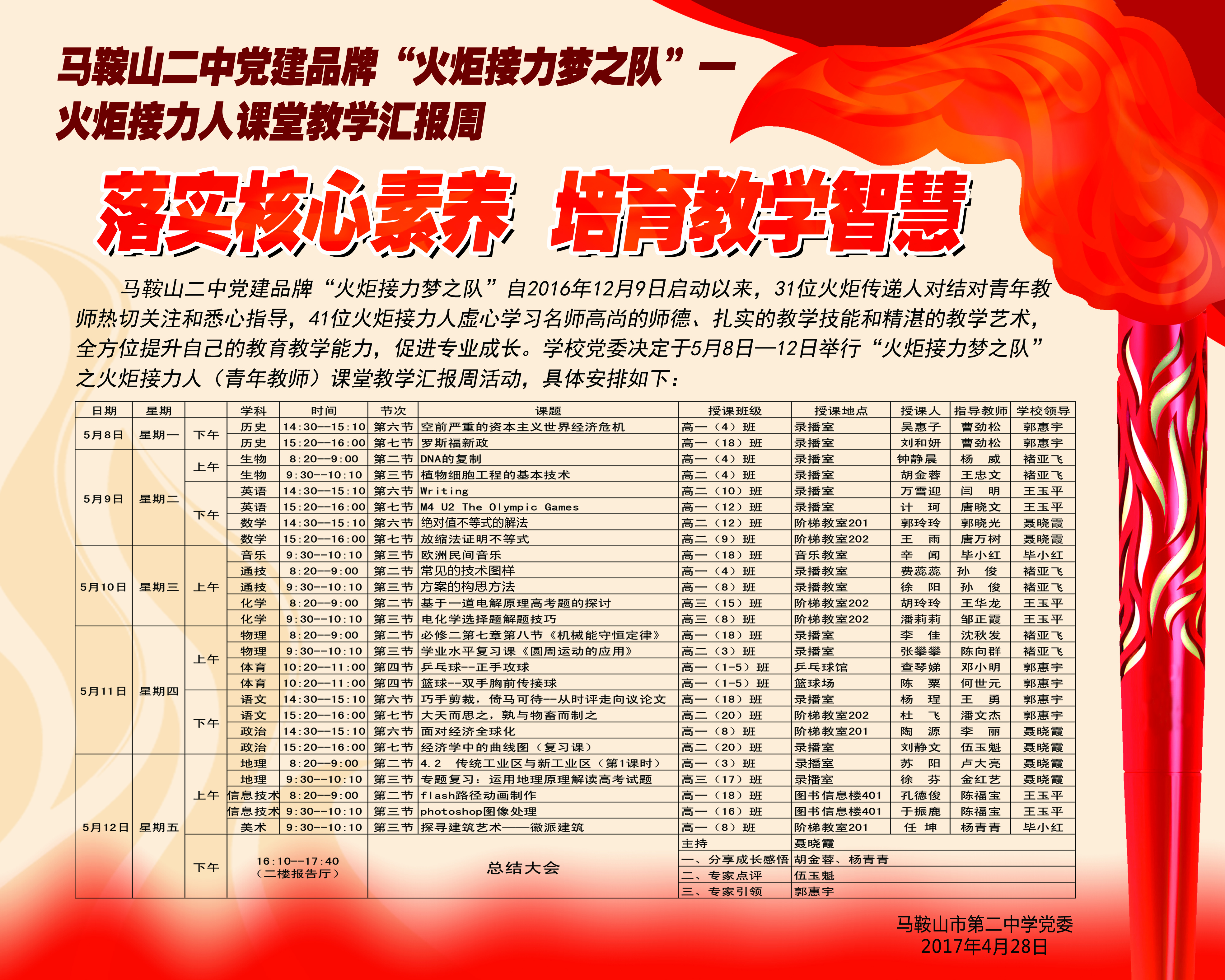 【活動預告】馬鞍(ān)山二(èr)中黨建品(pǐn)牌“火炬(jù)接力夢之隊”課堂教(jiāo)學匯報周安排