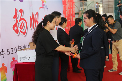 320班戴雨(yǔ)晨同學帶領全(quán)體高三學生進行畢業宣誓。宣誓(shì)後,同學們逐個從郭校長手中接過畢業紀念卡,經過畢業門走出會場。畢業(yè)門(mén)兩旁(páng),是手持鮮花(huā)的教師,他們目送學生離去。許多學生依依不舍地與教師握手、擁抱,表達這份深深的師生情。