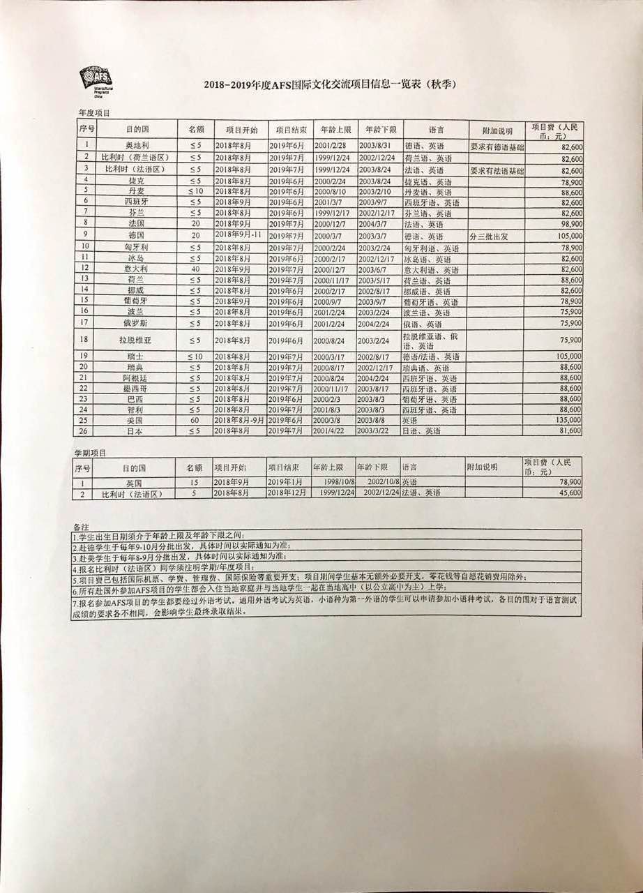 為加強中外(wài)人文(wén)交流,增加學(xué)生對不同文化,不同國家(jiā)的認識和理解,培養具有(yǒu)國際視野和跨文化交際能力的人才,中國教育國際交流協(xié)會AFS國際文化交流項目2018-2019年度秋季擬選派部分中學生分別赴美國,德國,法國,瑞士等近30個國家參加年度,學期(qī)跨文化教育交流活動。現(xiàn)就(jiù)項目事宜通知(zhī)如下:
