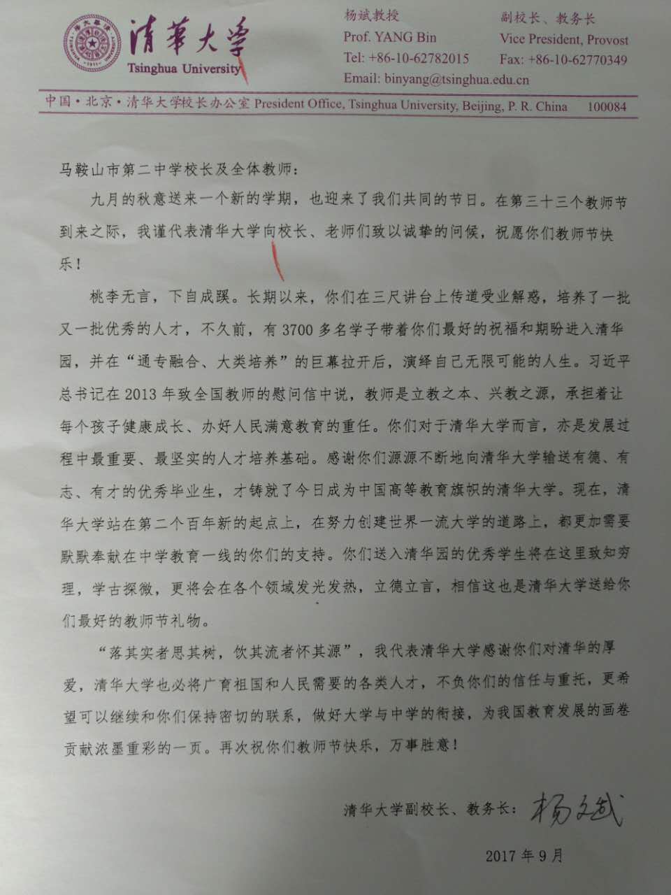 清(qīng)華大學副校(xiào)長、教務長楊斌(bīn)先生祝我校全體教師教師節快樂