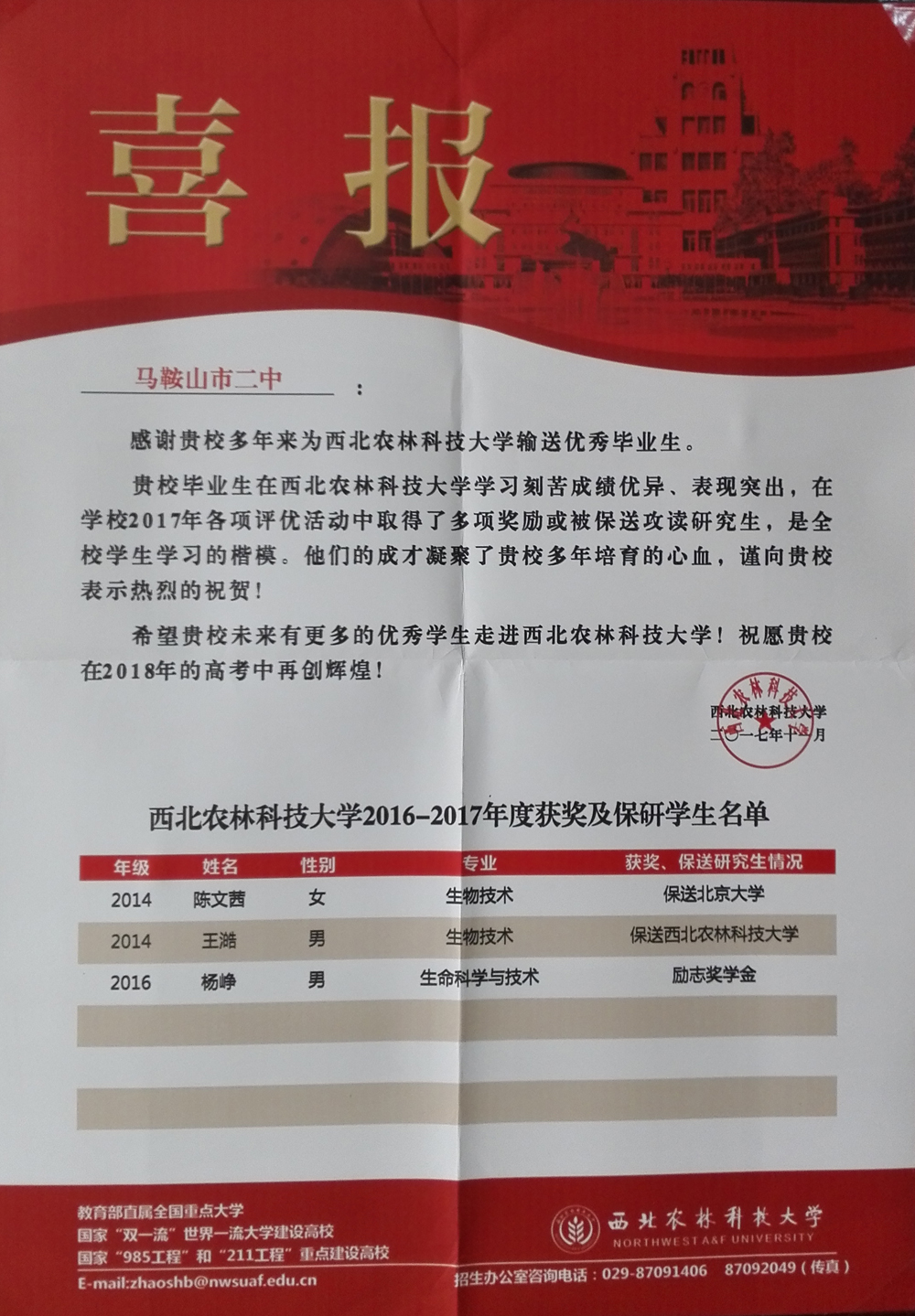 西北農林科技大學喜報