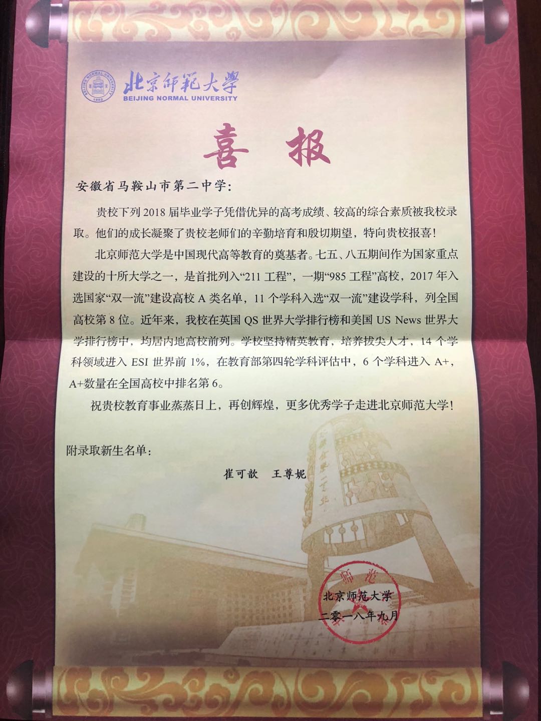 北京師範大學給我校(xiào)發來喜報