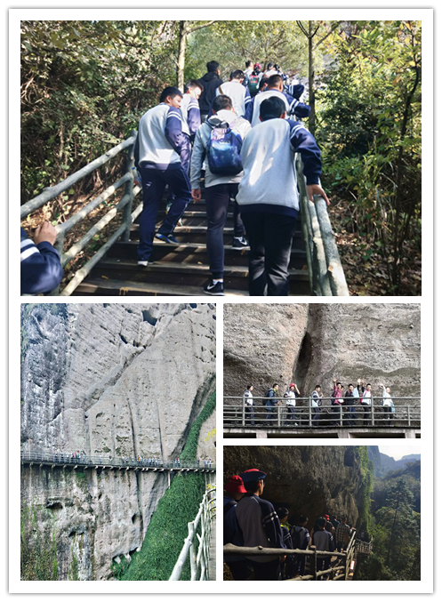 爬了將近十分鍾的山後(hòu),大家來到赫赫(hè)有(yǒu)名的龍虎山高(gāo)空棧道。棧道長約4公裏,時而寬闊,時而狹窄,同學們排成縱(zòng)隊,邊走(zǒu)邊欣賞高(gāo)空美景。盡管山勢險峻,但是棧道較為平緩,有的同學(xué)如履平地,前行中(zhōng)可以近距離(lí)觀察丹霞地貌,崖壁上大小洞穴,形態各(gè)異。