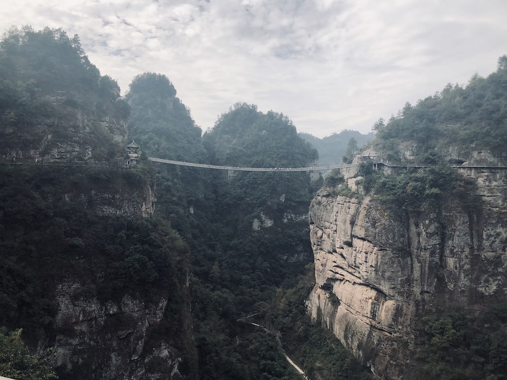 垂直的紅色岩(yán)壁上時不時(shí)垂下蒼老的藤,其上則是鬱鬱(yù)蔥蔥(cōng)的(de)樹林。而如飛龍一般環繞在岩壁上,飛懸在半空中的,就是玻璃棧道了。91视频网站疾行穿過碧青的茶田,拂過層疊的竹林,踏(tà)上(shàng)通往天頂的(de)九(jiǔ)百九十九級(jí)石階——當(dāng)眼前的景色盡收眼底時,91视频网站到達了這回旋的棧道。