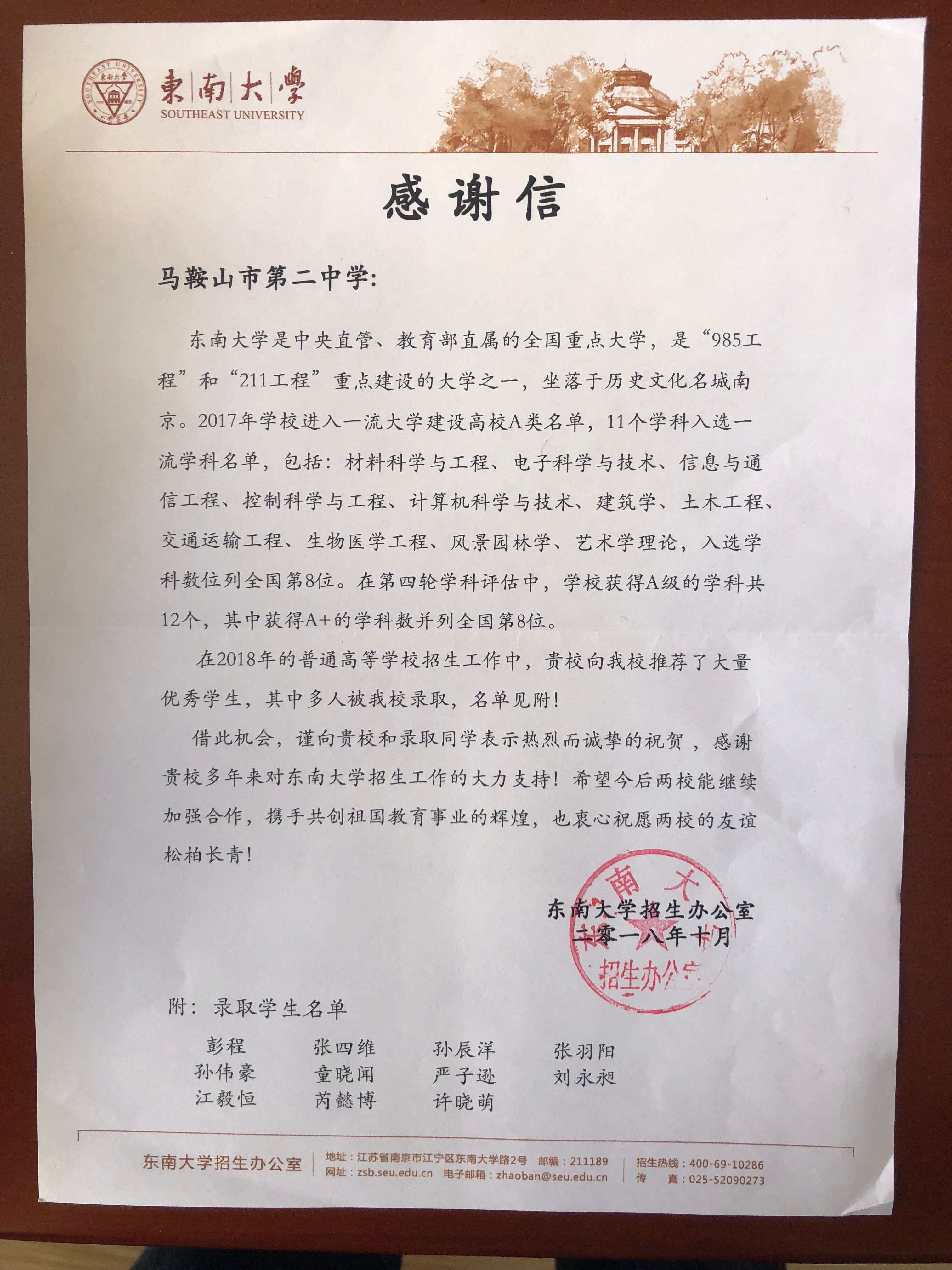 東南大學給我校發來感謝信
