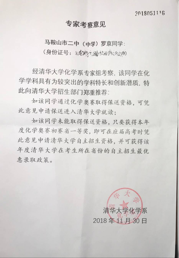 20181128-124日第32屆中國化學奧林匹(pǐ)克競賽(決(jué)賽)在山東(dōng)大學如期(qī)舉行,代表安徽省參加決賽(sài)的馬鞍山二(èr)中羅京同學通過奮勇拚搏,取得的國家二等獎(銀牌)的優異成績,並贏得清華大學的青睞(lài),獲得清華大學2019年在安徽省自主招生最優惠錄取資格(gé)。