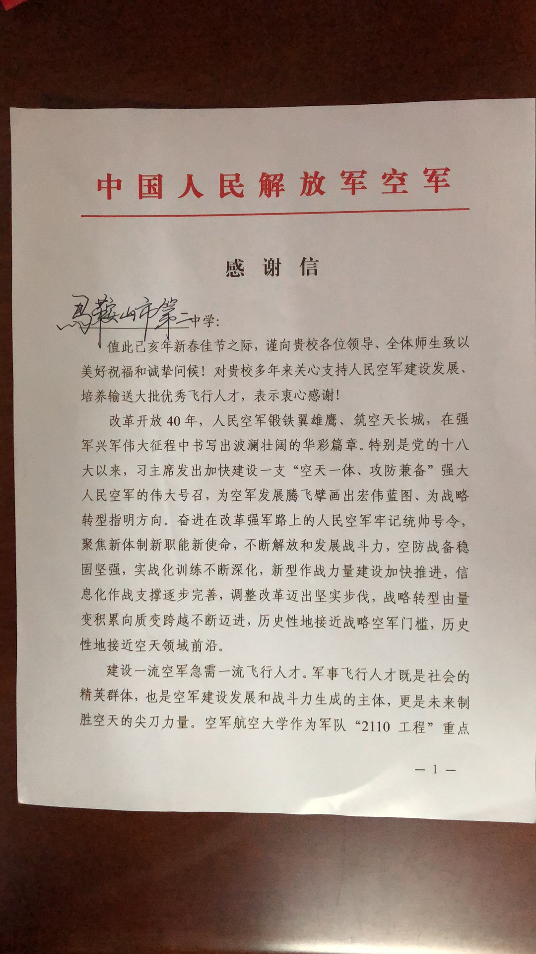 近日,馬鞍(ān)山二中收(shōu)到來自於中國人民解放軍空軍航空大學(xué)的感謝信。信中,感謝(xiè)學校為空軍培養輸送優秀飛行學員。