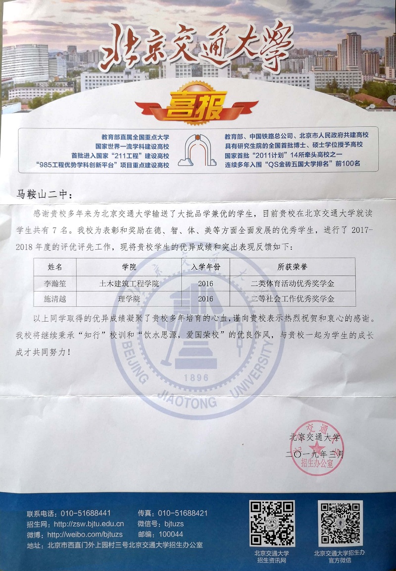 北京交通大學喜報