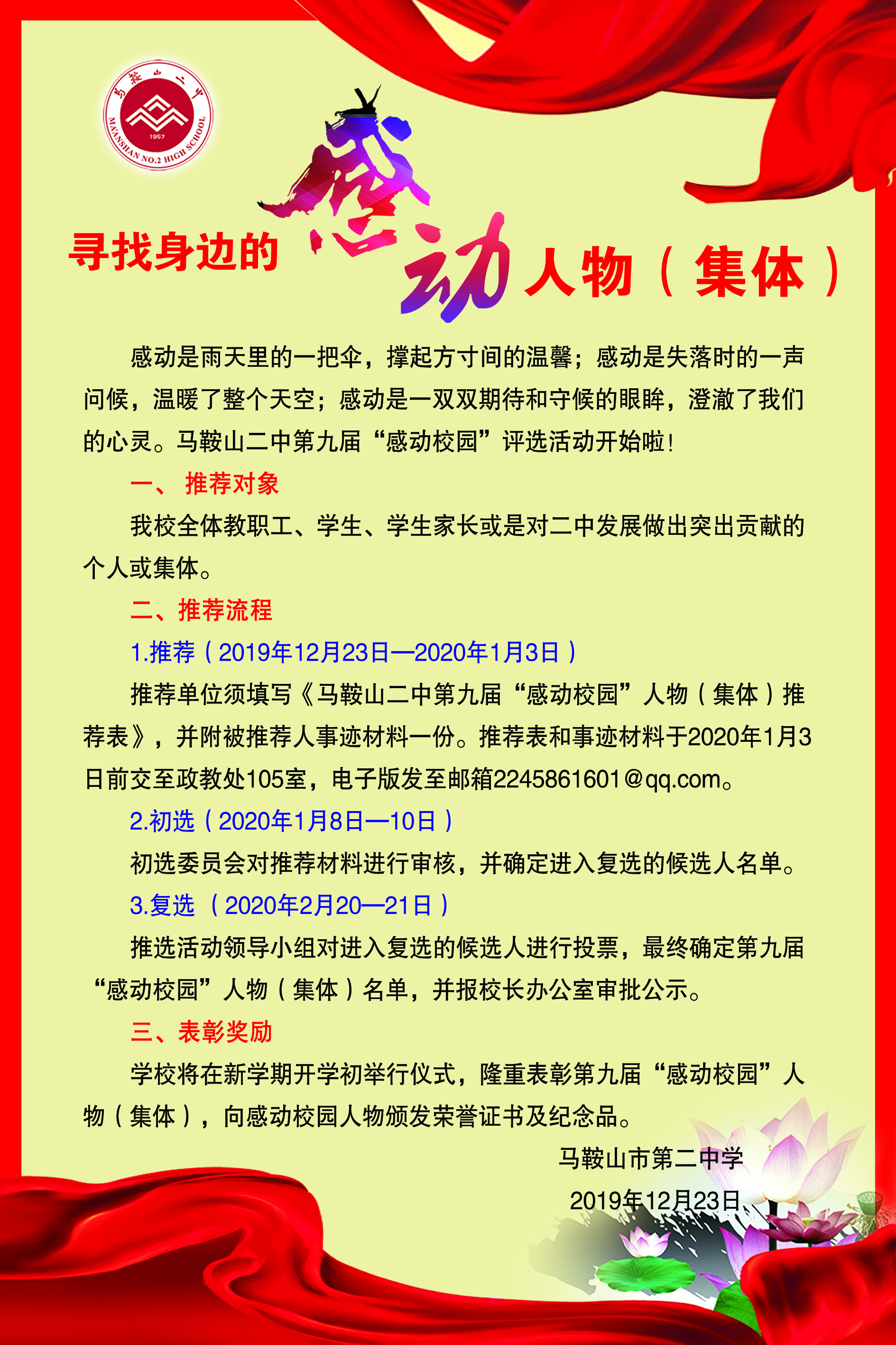 推薦單位(wèi)須填寫《馬鞍山(shān)二中第九屆“感動校園”人物(集體)推(tuī)薦表》,並(bìng)附被推薦人(rén)事跡材料一(yī)份。