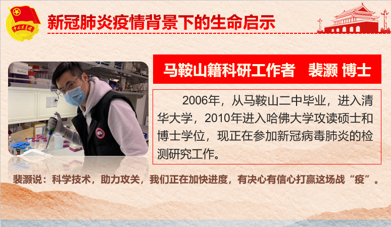 戰勝(shèng)疫情,保護生命,離不開科學技術。習近平總書記說,“人類同疾病較量最有(yǒu)力(lì)的武器就是科學技術,人類戰勝大災大疫離不開科學發展和技術創新”。很多大家熟知的中國科學家(jiā)——鍾南山院士、李蘭娟院士等,自(zì)疫(yì)情爆發,就一直在帶領團隊攻(gōng)克難關。馬鞍山籍(jí)的科研工作者(zhě)裴灝也正與團隊(duì)一起進(jìn)行新冠肺炎病毒的檢測研究工作。