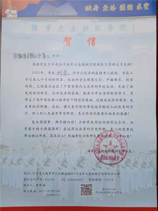 海軍大(dà)連艦艇(tǐng)學院發來賀(hè)信!