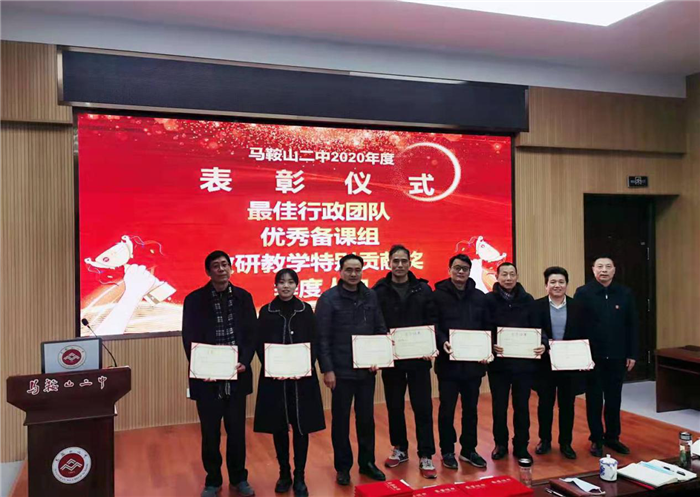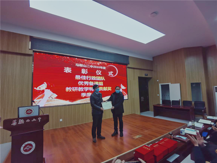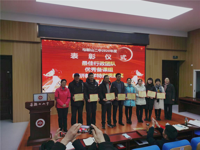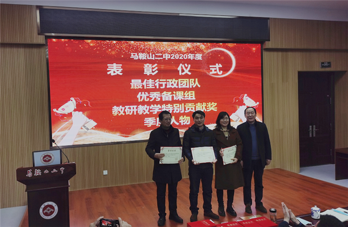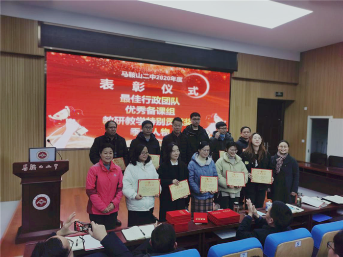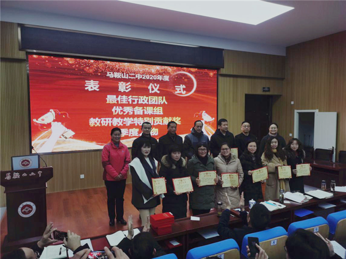 第二階(jiē)段,舉行各類先進表(biǎo)彰儀式:副(fù)校長慶曉宣讀《馬(mǎ)鞍山二(èr)中2020年度最佳行政團隊、優秀(xiù)備課組、教研教學特別(bié)貢獻獎、季(jì)度人物等各項表彰決定》,校領導分(fèn)別(bié)為獲獎代表頒獎。