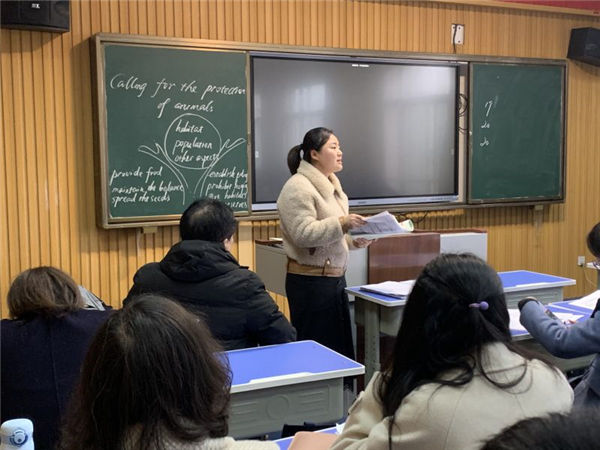 第二節課是由朱惠老師帶來的一節生動活潑的綜合技能課,朱老師以一則(zé)公益廣告導入,自(zì)然流暢地引出主題。整節課都圍繞“人與動物的關(guān)係”展開(kāi),基於語篇。朱老師先是引導學生利用已有(yǒu)的知識框架探(tàn)討動物(wù)的重(chóng)要性,然(rán)後(hòu)通(tōng)過讓學生欣賞視頻和語篇,層層推(tuī)進,通過提問、填空等方式,引導學(xué)生進一步思考人類行為對動物的危害;與此同時,鼓勵學(xué)生積極討論,引發(fā)學(xué)生對如何保護動物進行深入思考,在(zài)小組討論之後,讓學生基於討論結果在10分鍾內小組完成一篇演講稿的創作。在課(kè)堂的最後,朱老師邀請了3名同學當堂展示了他們小組的作品,並讓(ràng)其他小組成(chéng)員分別對他們給(gěi)出了評價。