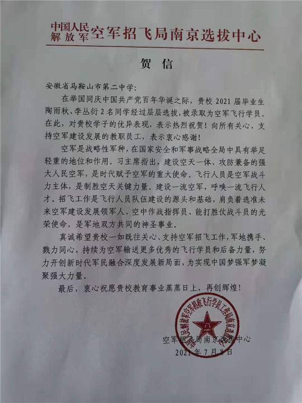 李叢衍同(tóng)學和陶雨秋(qiū)同學憑借過硬的身體條件(jiàn)和優秀的高考成績,被錄取為空(kōng)軍飛行員,體現了馬鞍山二中堅持立德樹人、為黨育人、為國育才的辦(bàn)學理(lǐ)念。