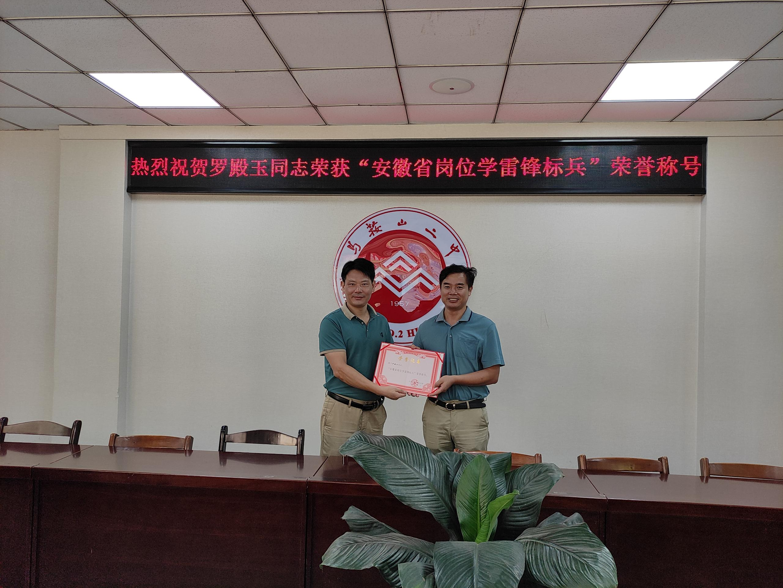 我校總務處主任(rèn)羅殿玉同誌榮(róng)獲(huò)“安徽省崗位學雷鋒標(biāo)兵”榮譽稱號,8月3日,市教育局四級調研員潘(pān)生根來校為(wéi)羅殿玉同誌授獎。