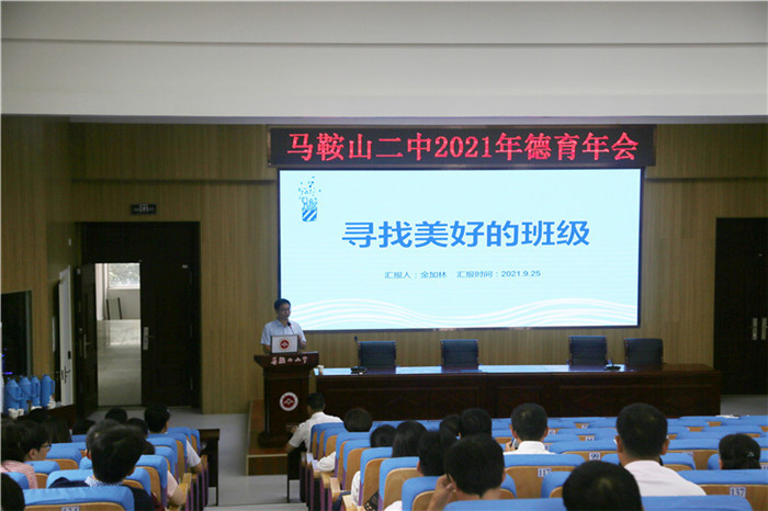 淡日晴光消暑氣,淺秋清風除纖塵。2021年9月25日,馬(mǎ)鞍山二中2021年德(dé)育年會在校二樓報告廳舉行。年會的主題是“出發,去尋找美好的班級”。本次會議由校黨委副書記聶曉霞主持(chí),校中層(céng)以上幹部、年級部成員、全體班主任及35周歲以下青年教師(shī)參加。