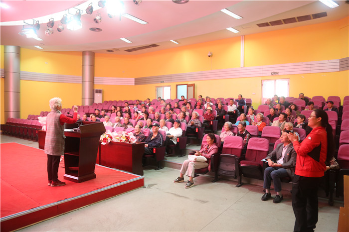 壽(shòu)星代表鄭式(shì)宏滿懷深(shēn)情地表達了對黨和學校的感謝,退休(xiū)教師仝茂霞指揮大家合唱一首《最美夕陽紅》。