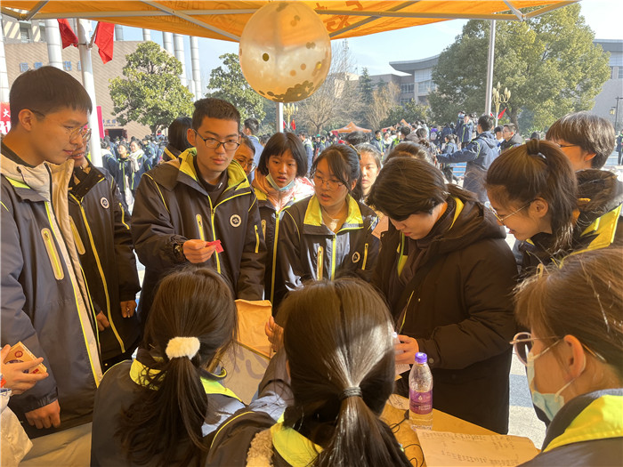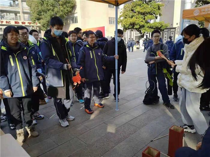 紅彤彤的燈籠掛滿四周,充滿喜慶與歡樂,同學們充滿(mǎn)新奇地取下喜歡的燈籠,在攤位前排上了長龍。那是雛鷹文學社舉行的(de)“華燈璀璨”活動。看!哪怕未能猜對燈謎,同學(xué)們也(yě)能拿走一盞燈籠,帶(dài)走這一抹象征新年的(de)紅色,寄寓無限生機!而猜對的同(tóng)學就更為喜氣洋洋,攥著(zhe)手(shǒu)裏的(de)獎券(quàn),向下一(yī)個場地進發。