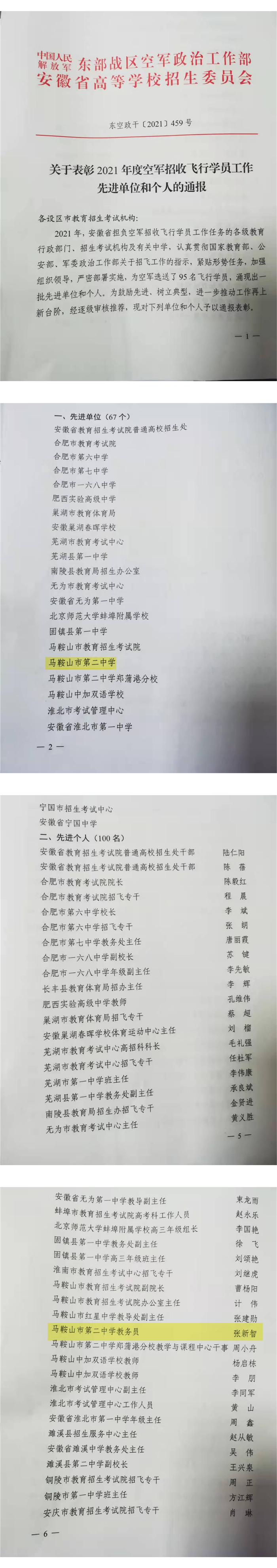近日,中國人民解放軍東部戰區空軍(jun1)政治工作部與安徽省高等學校招生委員會聯合下發了《關於表彰2021年度(dù)空軍招收飛行員工作先進單位和個人的通報》的文件,我校榮獲“空軍招飛工作先進(jìn)單位”稱號,張新智老師榮獲“空軍招飛工作先(xiān)進個人”稱號。