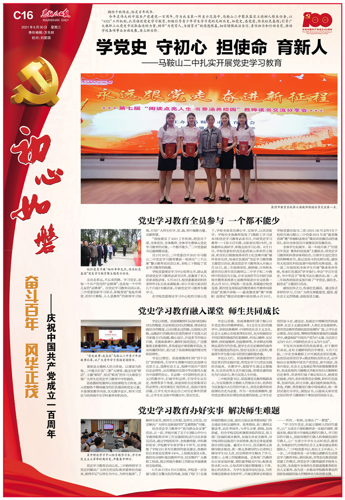 6月29日,在馬(mǎ)鞍山市慶祝中國共產黨成立100周年“兩優一(yī)先”表彰大會上,馬鞍山二中黨委(wěi)被中共馬鞍山市委授予“馬鞍山市先進基層黨組織”光榮稱號。