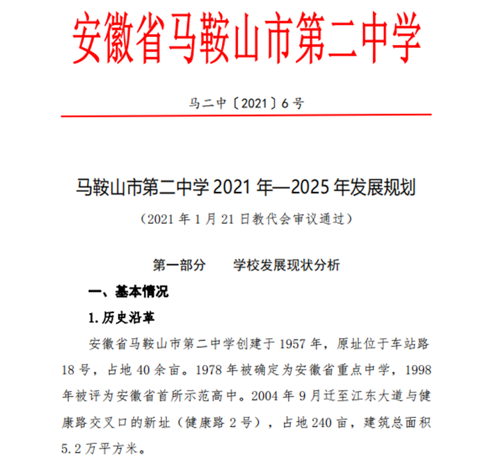 為促進學校科(kē)學、優質(zhì)、可持續發展,學(xué)校根(gēn)據黨和國家的教育方針政策,堅持教育改革,立足自身實際,在充分調研、反(fǎn)複(fù)論證、廣泛征求意(yì)見的基礎上,製定並出台了《馬(mǎ)鞍山市第二中學2021年—2025年發展規劃》,為今後五年的發展擘畫了總體方案、製定了具體目標、設計了實施路徑。