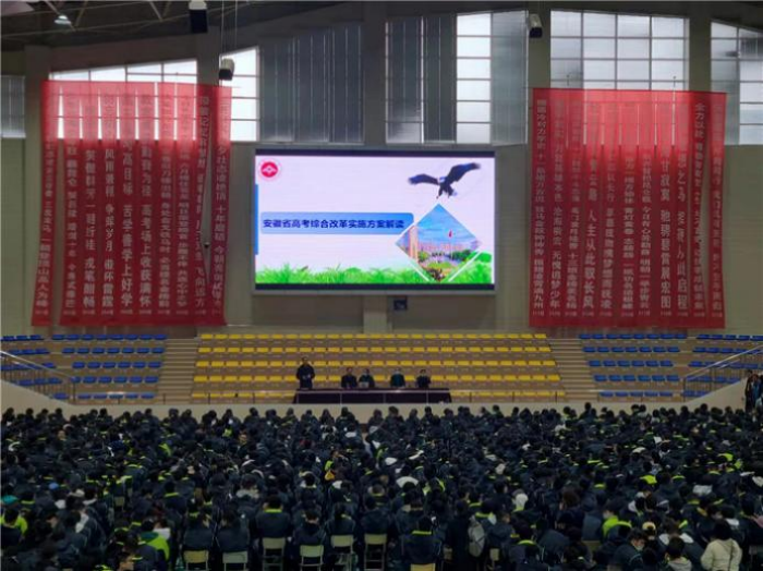 2021年9月13日,《安徽省深化普通高校考試招(zhāo)生綜合改革實施方案》正式發布,確定(dìng)我省從2021年秋(qiū)季學期起,實施高考綜合改革。為了讓每一位學生和家長都掌(zhǎng)握高(gāo)考綜合改革政策,我校召開“安(ān)徽省高考綜合改革實施方案宣講會”,對高一年級全體學生及家長進行了政策宣講(jiǎng)。