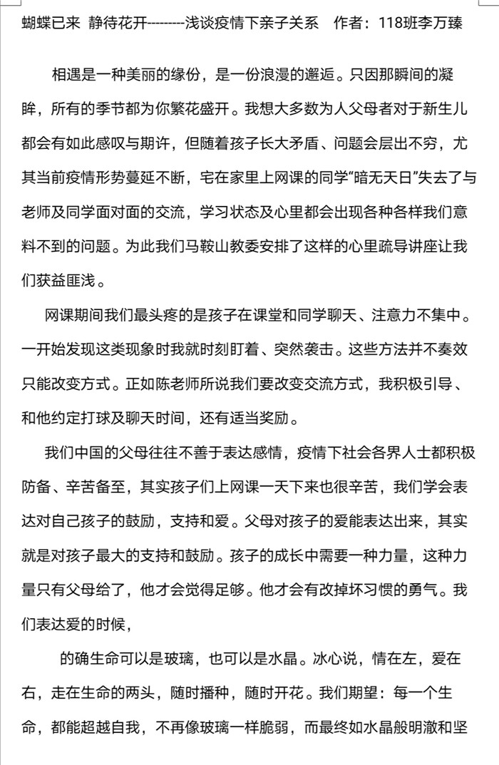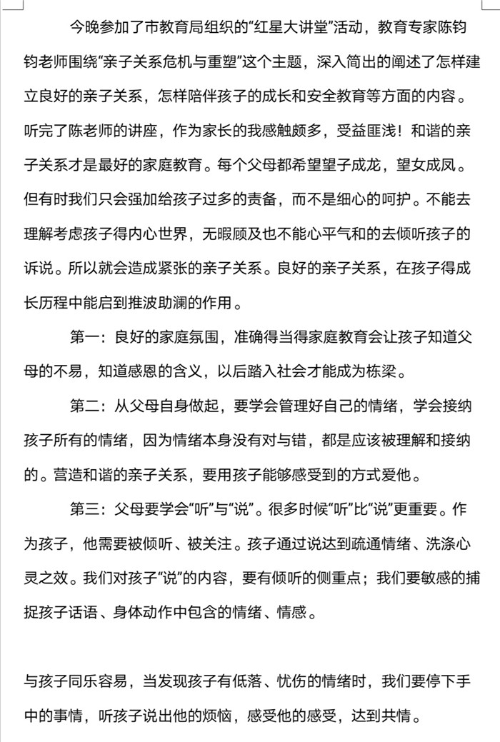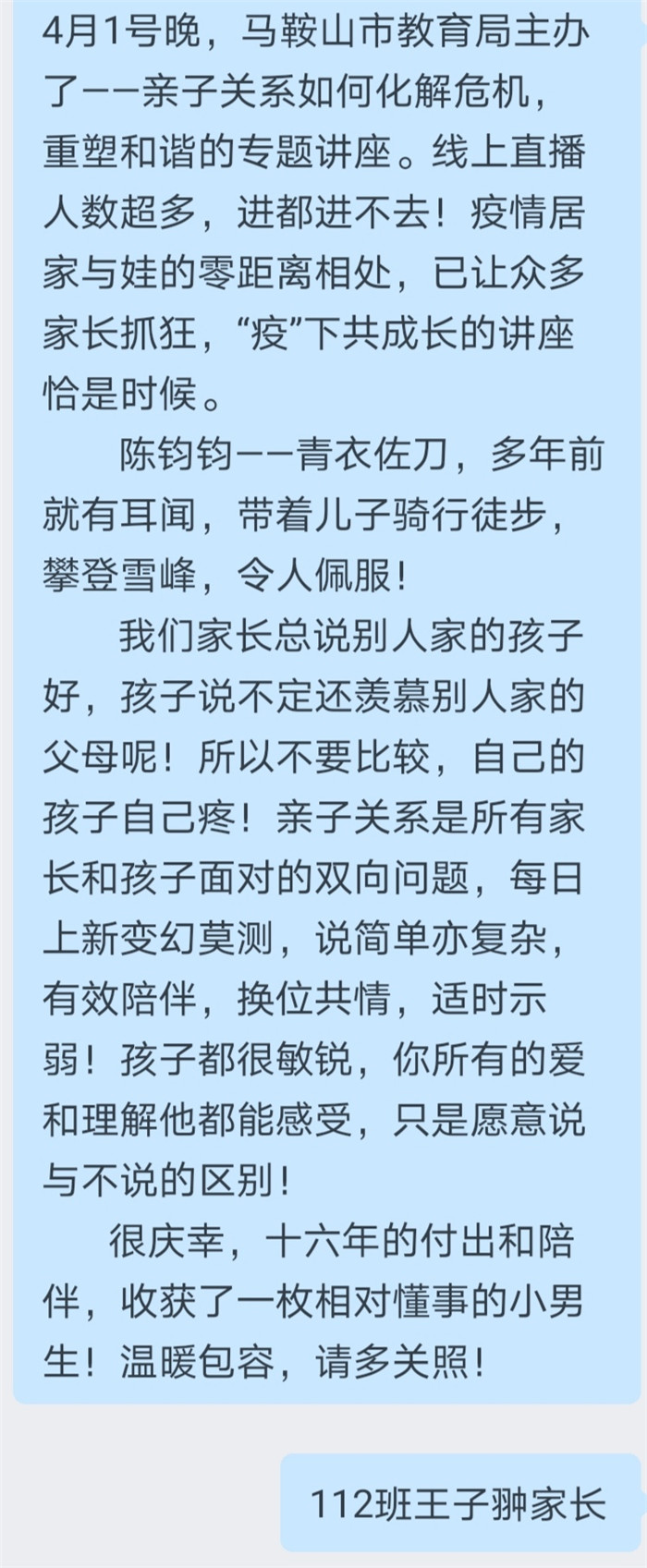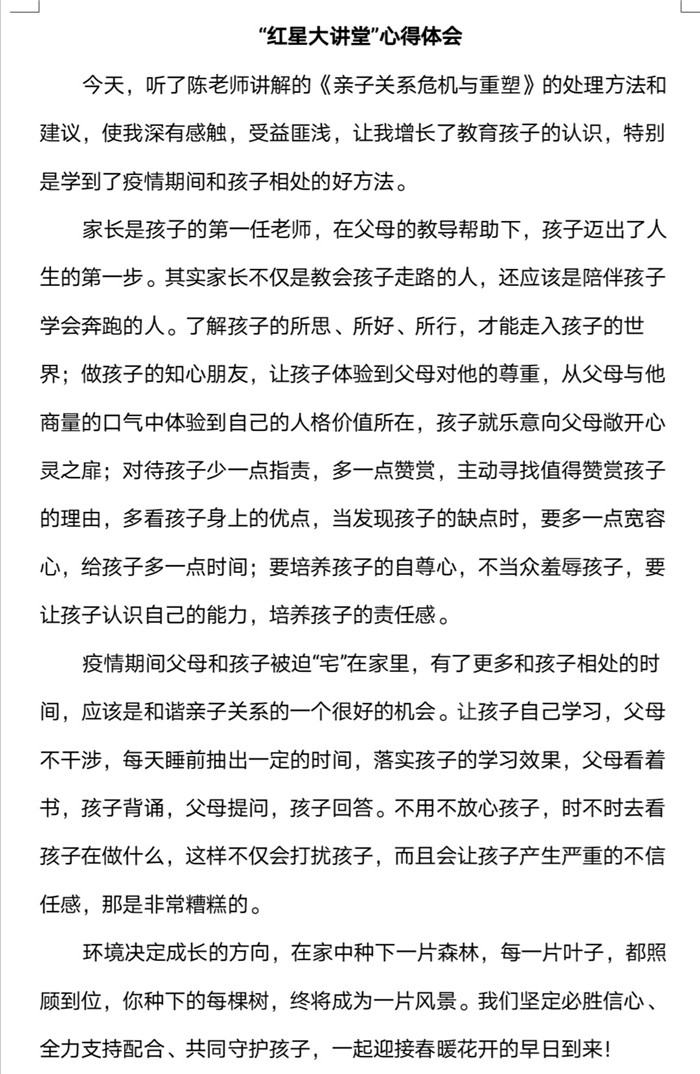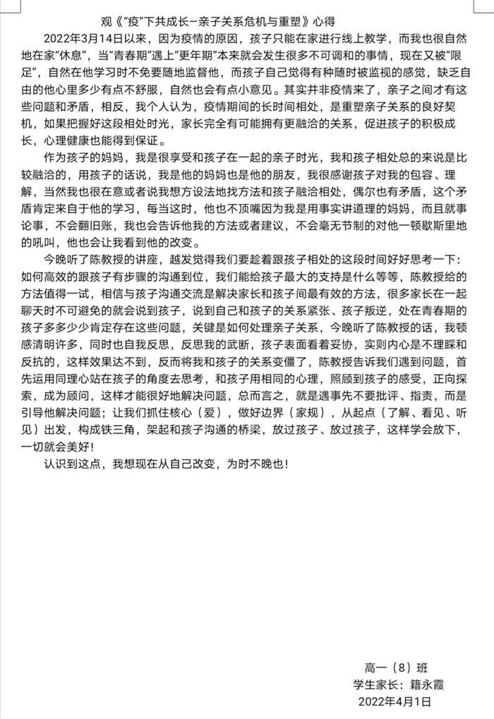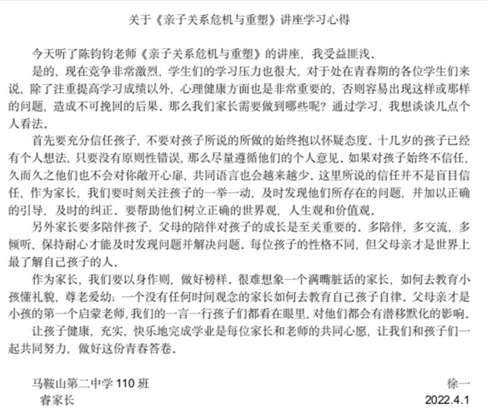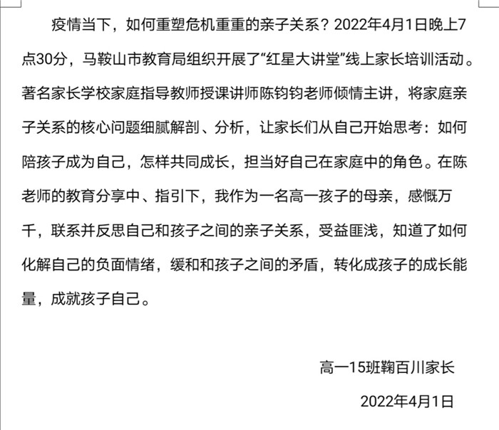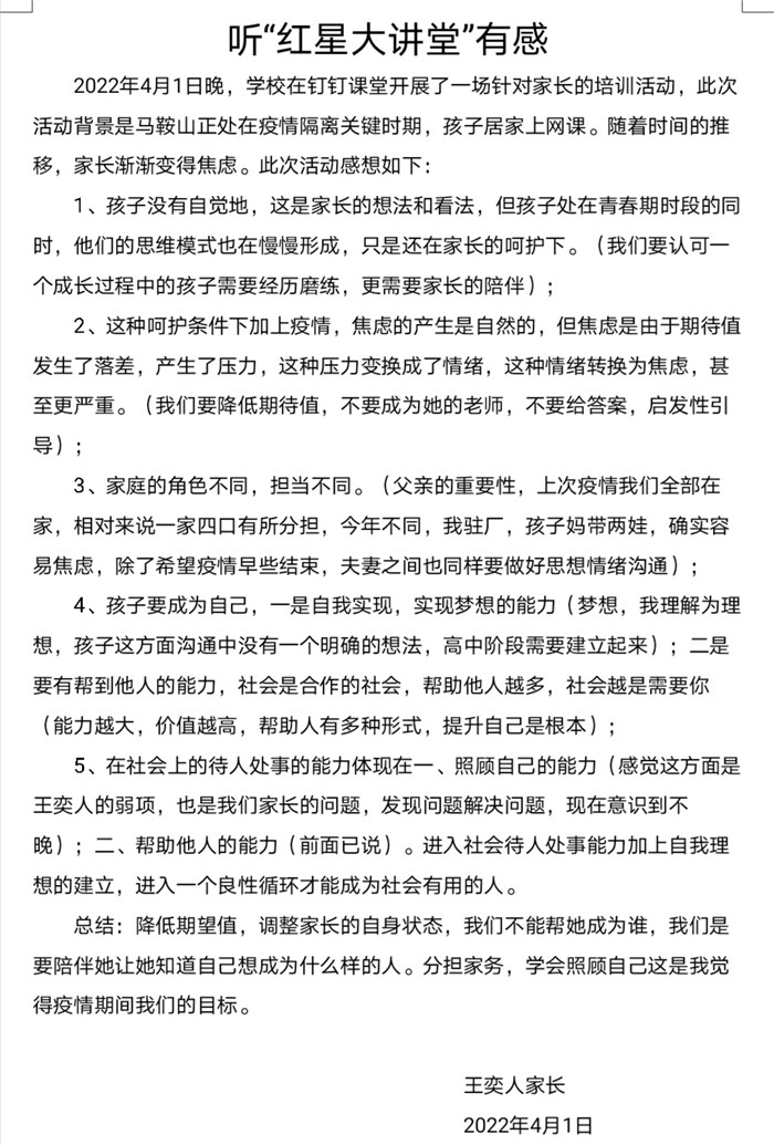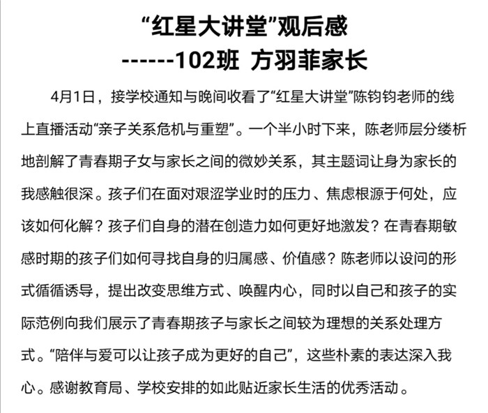 本次“紅星大講堂(táng)”線上家長培訓活動不僅有(yǒu)利於營造良好的家校共育氛圍,還能幫助家長們更新(xīn)家庭教育觀念、掌握家庭教育的現代(dài)科學知(zhī)識和方法,對營造適宜青少年健康成長的(de)家庭教育環(huán)境具有重要意義。在這樣一個(gè)學生居(jū)家上課(kè)的特殊時期,這堂為家長們特別定製的“網課”恰(qià)似一(yī)場“及時雨”,家長們紛紛(fēn)表示受益匪淺,並(bìng)與我(wǒ)們分享了他們的心得體會。高一(9)班(bān)一位家長表示將“堅定必勝信心,全力支持配合,共同守(shǒu)護孩子,一起迎接春暖花開的早日到來”。