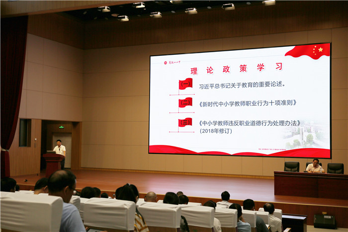 王玉平為全體教職工作了理論(lùn)政策學習輔導報告。他強調,大家要深入學習貫徹習近平總書記關於(yú)教育的重要論(lùn)述,並帶領全體教師認真學習了《新時代中(zhōng)小學教師職業行(háng)為十項準則》《中小學教師違反職業道德行為處理辦(bàn)法(2018年修訂)》。
