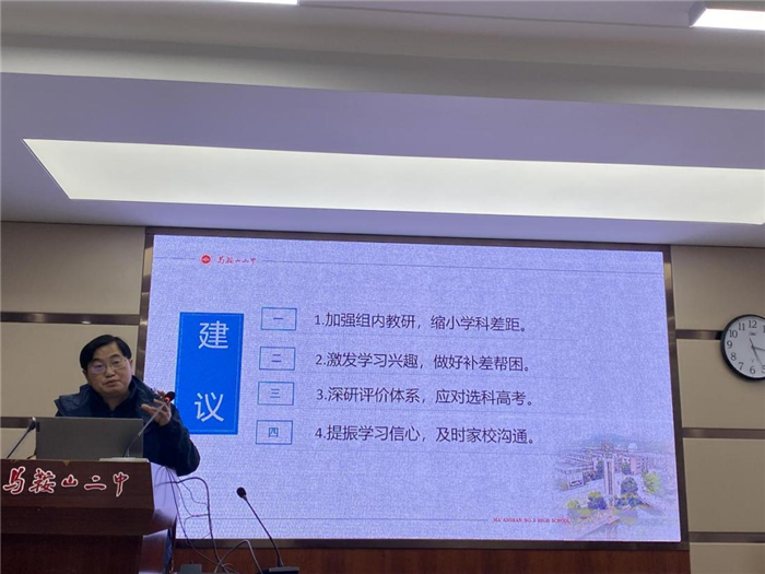 會議議程共分(fèn)為三項,教導(dǎo)處主任葉張平(píng)首先針(zhēn)對此次高二年級期中檢測(cè)成績做了係統的分析,他(tā)結合統計數據(jù)對期(qī)中(zhōng)檢測的基本情況進行了說明。肯定了教(jiāo)師(shī)在教學中取得的成績(jì),並(bìng)針對出(chū)現的問題,提(tí)出了四點建議:首先要加強組內教研,縮(suō)小學科差距;其(qí)次要激發學習興趣,做好補差幫困;第三(sān)要(yào)深研評價體係,應對選科(kē)高考;最後要提振學習(xí)信心,及時家校溝通。