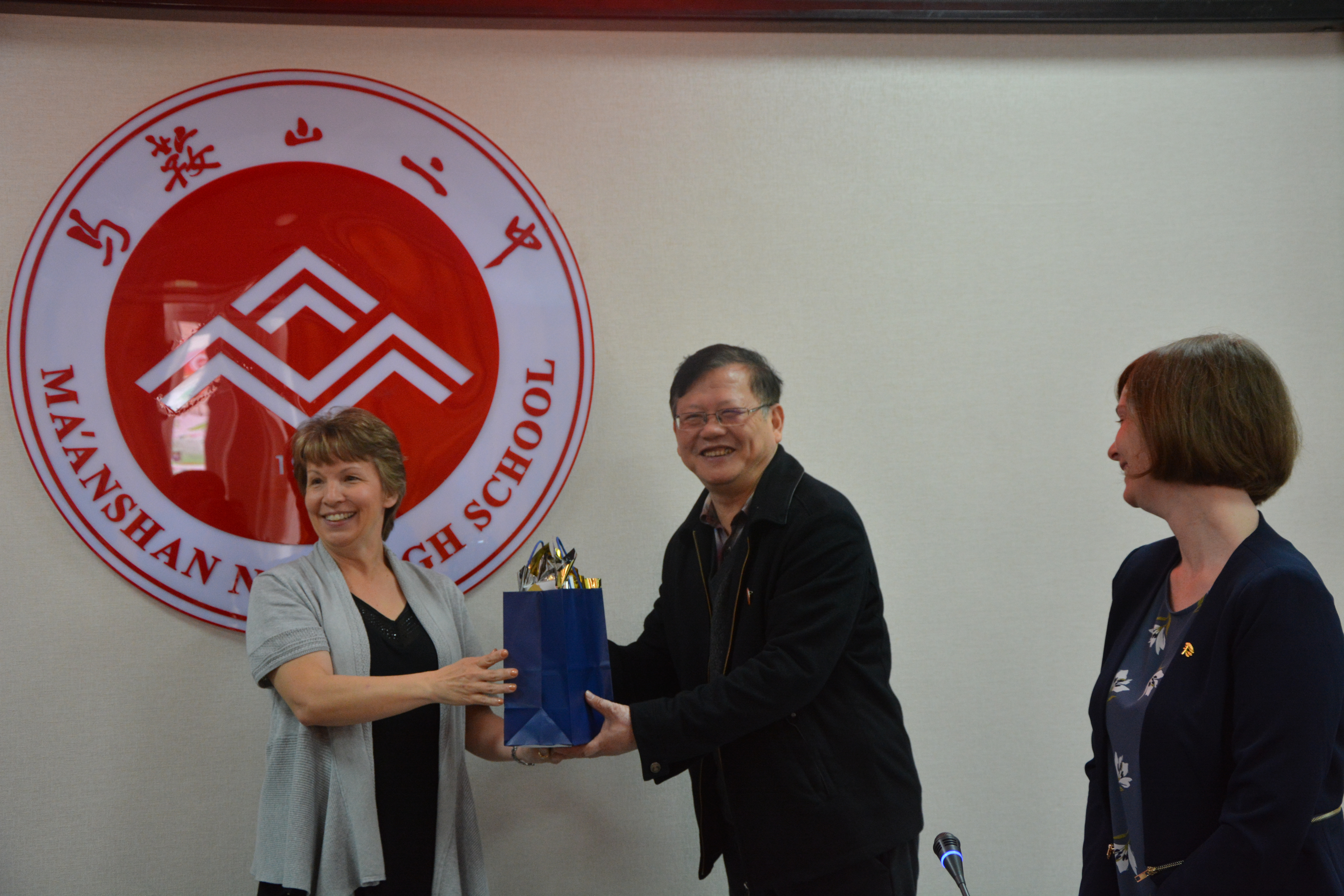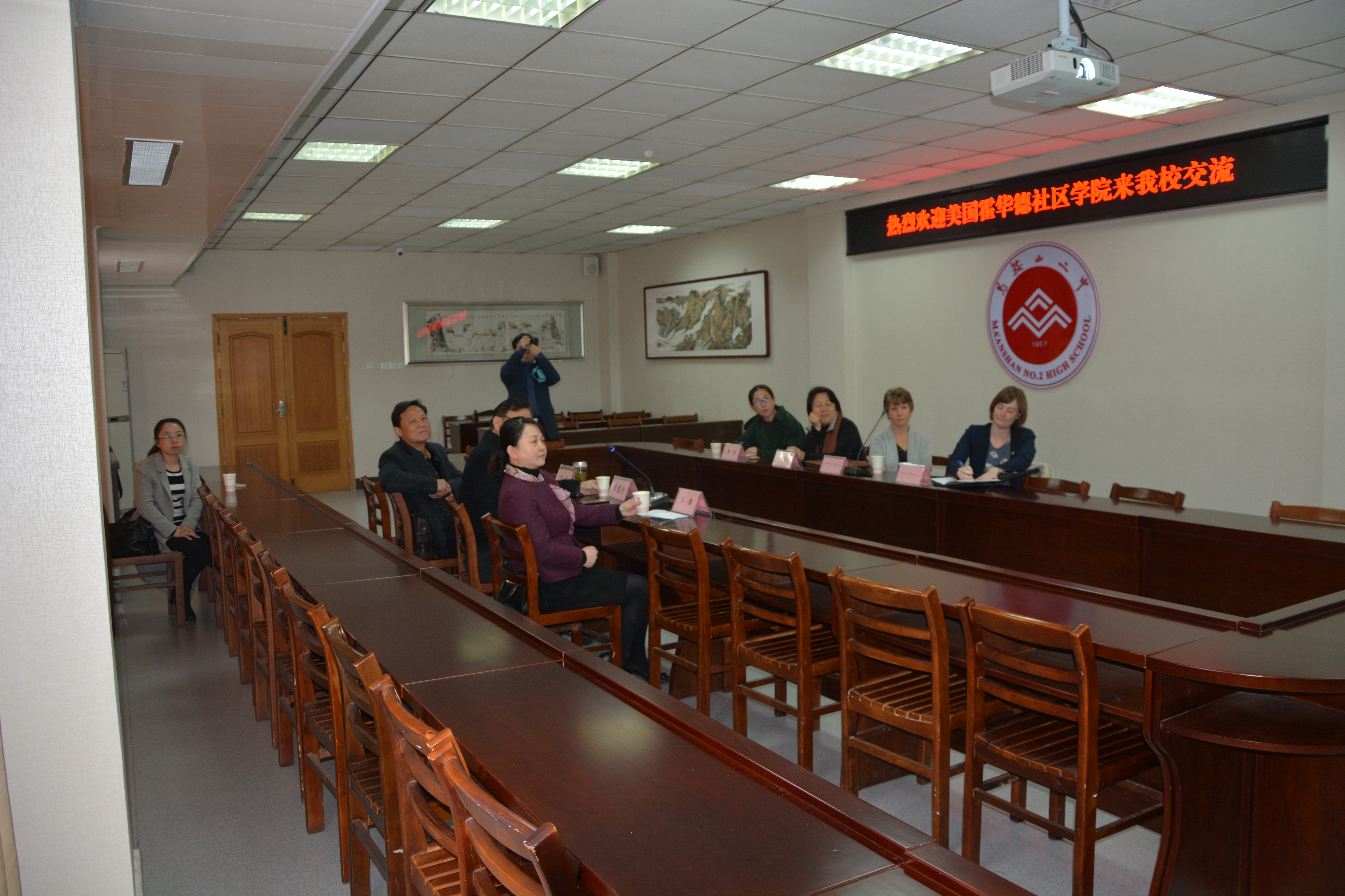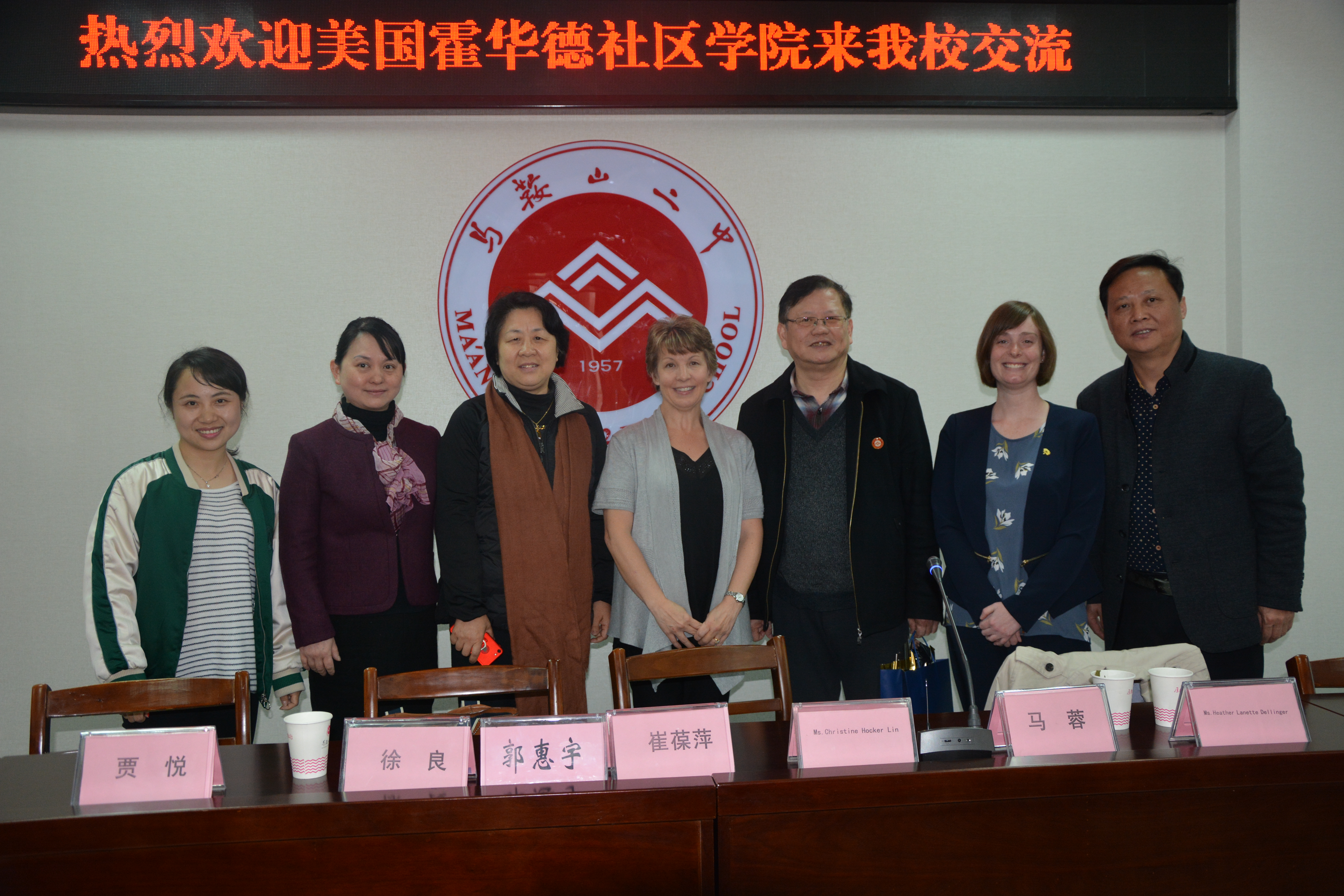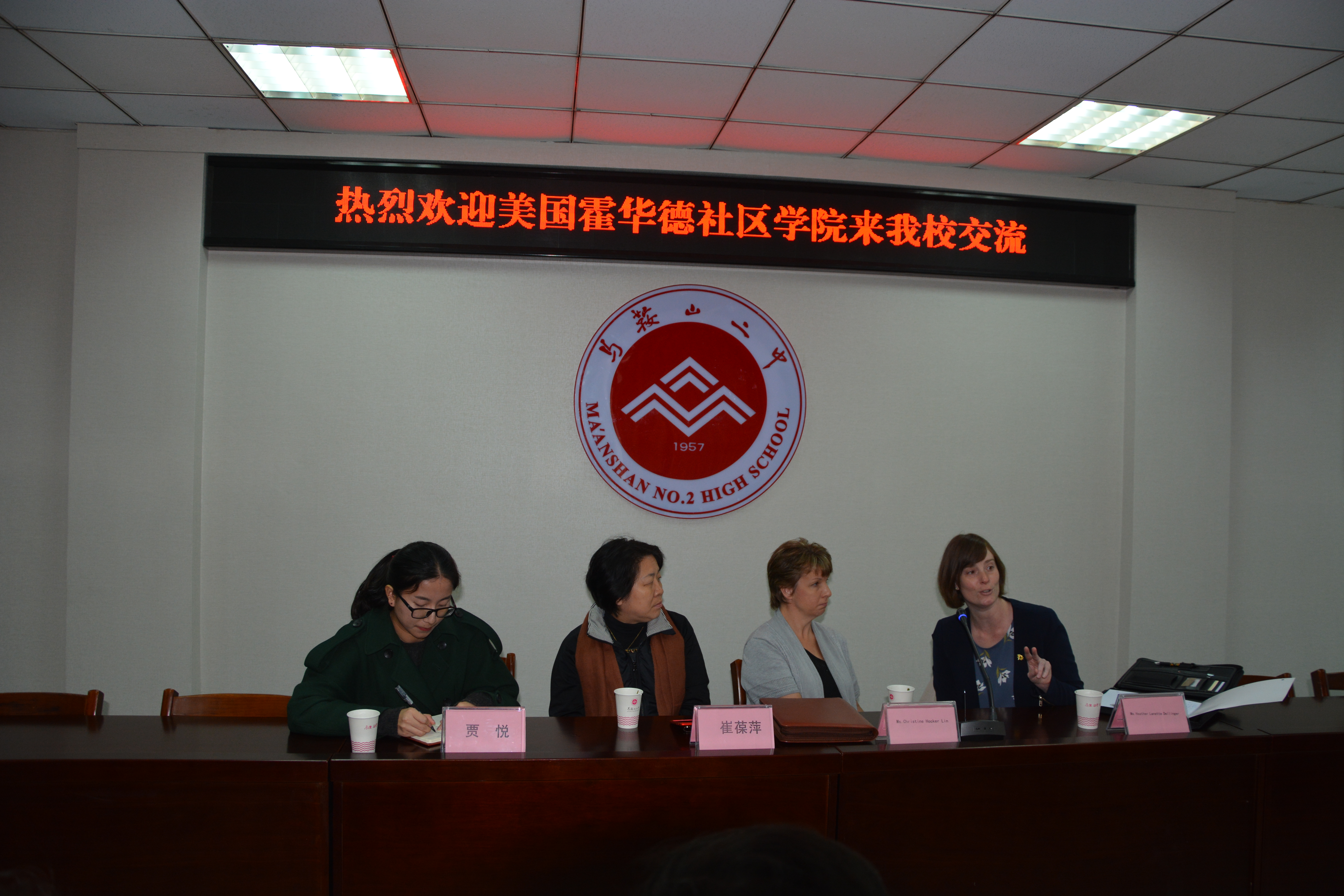 首先,郭校長帶領外國友人參觀校園。 郭校長著重介紹了我校建校60周年以來的發展曆程,以及二(èr)中的校園文化。之後,在行政樓一樓會議室,在市外辦馬蓉主任的主持下,美國霍華德社區學院(Howard Community College)代表團與我校進行了進一步交流。會議伊始,馬蓉主任首先介紹了與會來賓(bīn),並邀請我校國際處陳(chén)天才主任介紹了近年來馬鞍山二中國際交流的基本情況。隨後,美國(guó)馬裏蘭州霍華德社區學院代表Ms. Christine Hocker Lin 和(hé) Ms. Heather Lanette Dellinger 兩位女士,首先(xiān)高度評價了我校(xiào)國際交流近些年來所取得的成就,並預祝(zhù)我校60周年校慶(qìng)取得圓滿成功,接著就霍華德社區學院概況及辦學(xué)優勢和招生情況分別做出(chū)說明,鼓勵更多中國學生到美國交流學習,體(tǐ)驗美國文化。之後,省外辦友城處崔葆萍(píng)處長(zhǎng)表示,美(měi)國馬裏蘭州是安徽省的友好省份,兩省已經在多(duō)個領域開展了各種合作(zuò),希望(wàng)在教育領域能夠深化合作。最後,郭惠宇校(xiào)長對此(cǐ)次霍(huò)華德(dé)社區(qū)學院(Howard Community College)代表團來(lái)我校參觀交(jiāo)流再次表示歡迎和感謝,並殷切希望(wàng)91视频网站共同(tóng)努力,為年輕(qīng)人的(de)交流、發展創作更多機(jī)會。