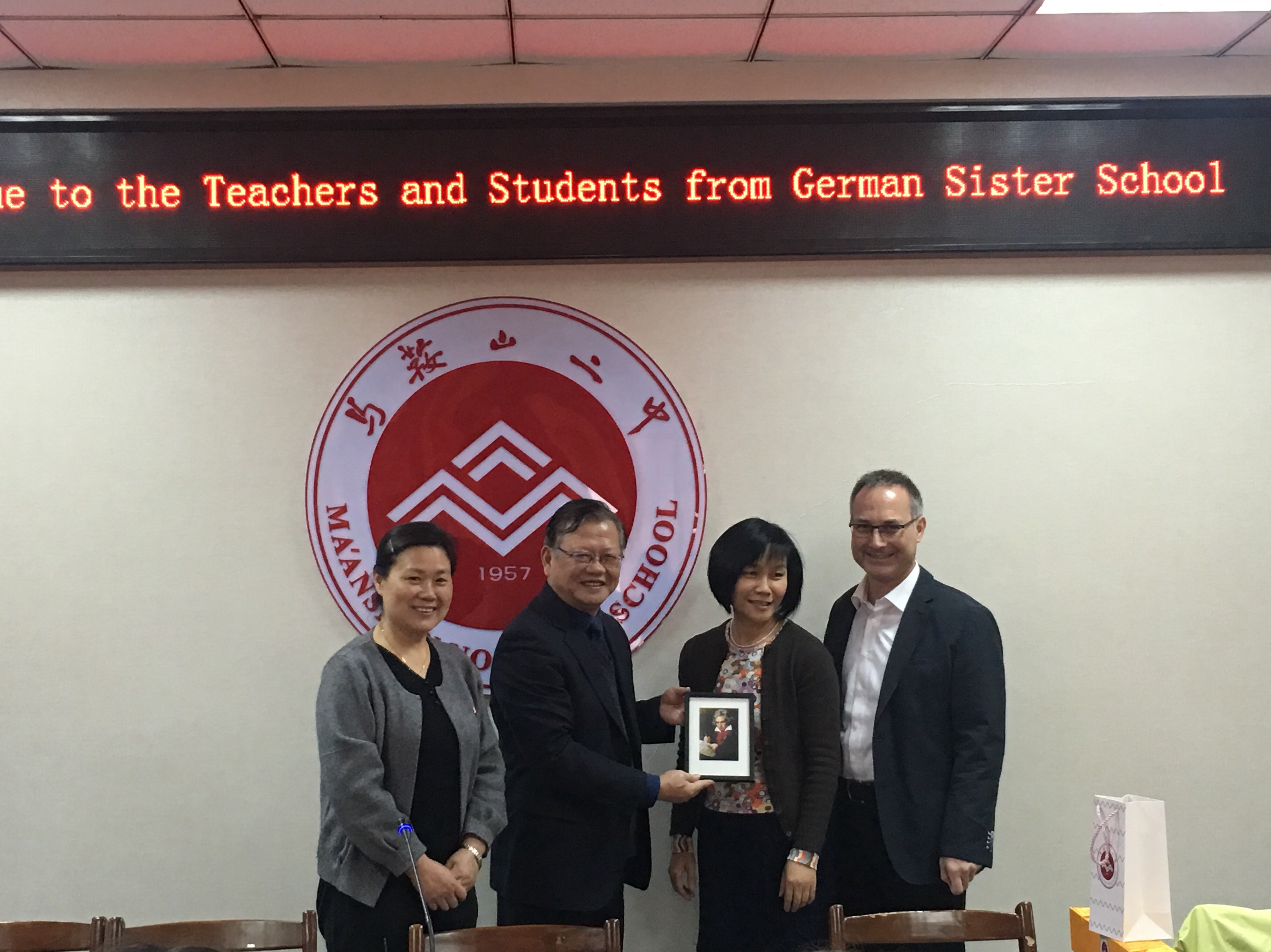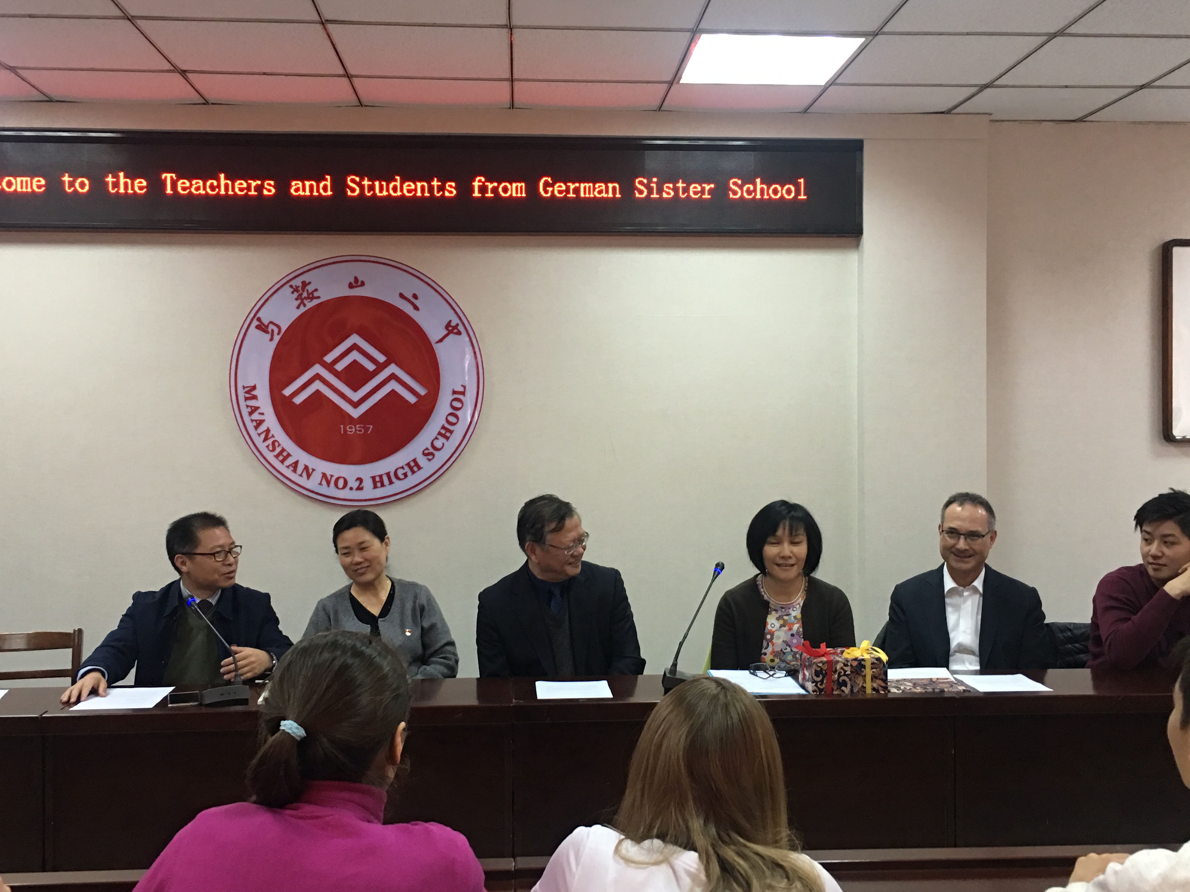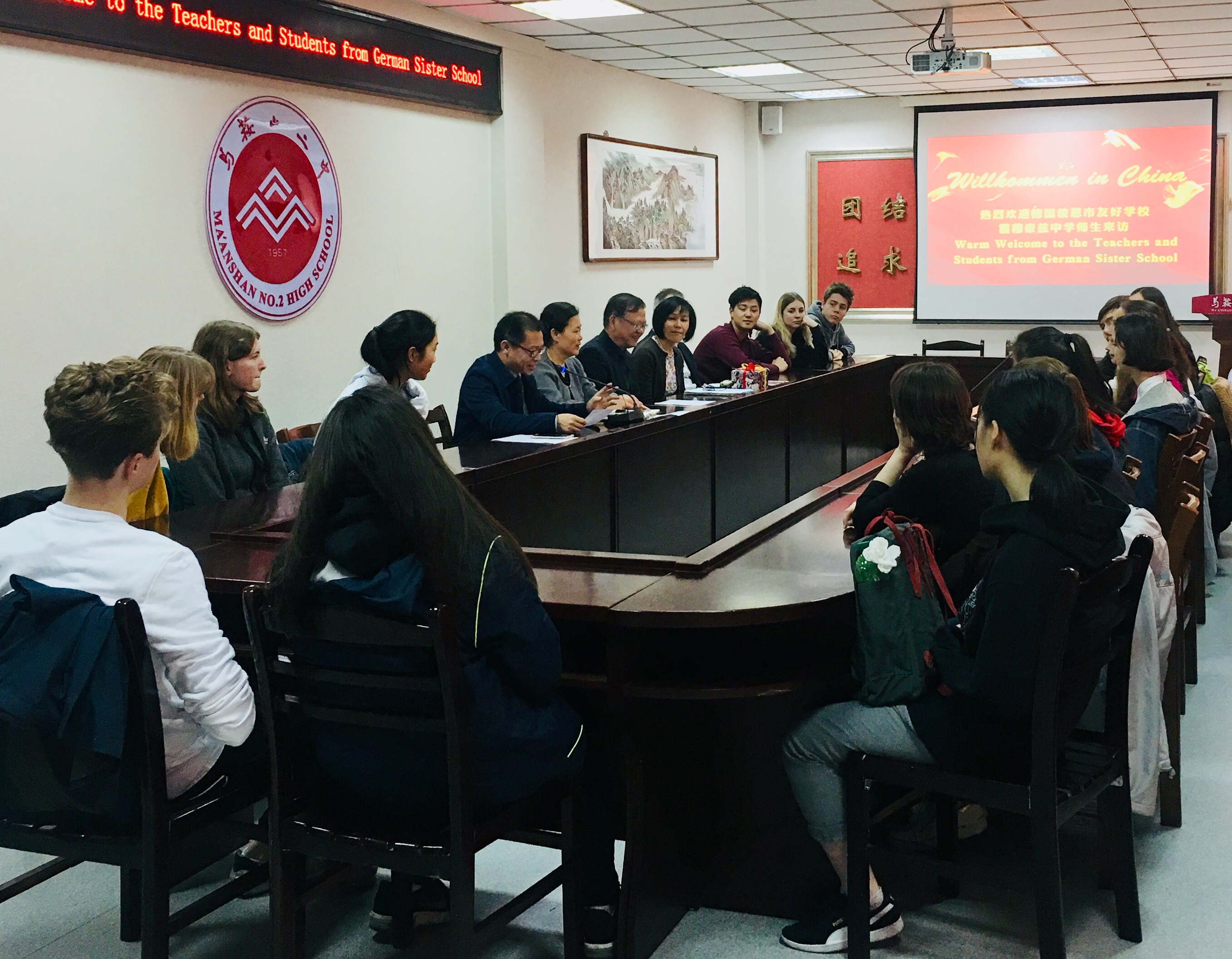 2019410星期三下午三(sān)點,馬鞍山二中友好(hǎo)學(xué)校德國波恩市(shì)霍穆豪茲中學師生團歡迎會於校一樓會議室舉行。德方領隊(duì)沈勇(yǒng)老師、何而格·弗蘭克(kè)老(lǎo)師和我校郭惠宇校長、聶曉霞書記蒞臨會(huì)議。