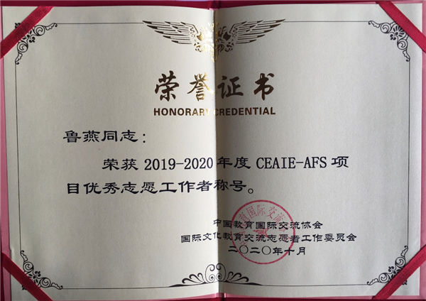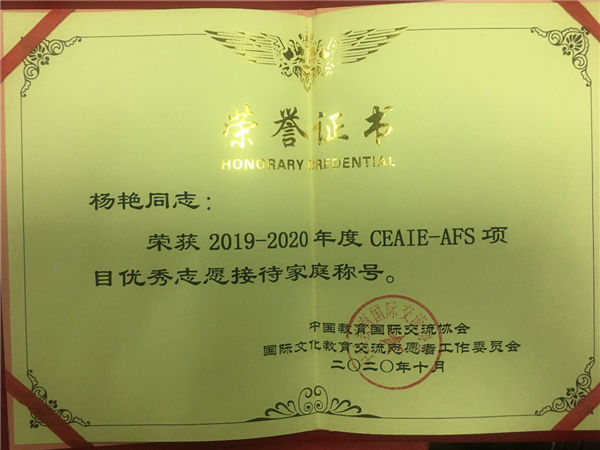 大會對(duì)2019-2020年度(dù)CEAIE-AFS國際文化交流項目做出貢獻的單位和個人進行了表彰。我(wǒ)校楊豔家庭(tíng)榮獲CEAIE-AFS優秀誌願接待(dài)家庭稱號,魯燕老(lǎo)師(shī)榮獲優秀誌願工作(zuò)者稱號。