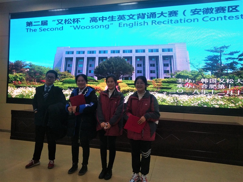 在12月15日韓國又送大學主辦、合肥第十一中學承辦的第(dì)二屆“又鬆杯”高中生英文背誦(sòng)大賽(安徽賽區決賽)中,我校選手力壓群雄(xióng),戰績彪炳。其中俞曦雅、丁怡瑞同學包攬一(yī)等(děng)獎;劉雨航和姚卉同學分獲二、三等獎。