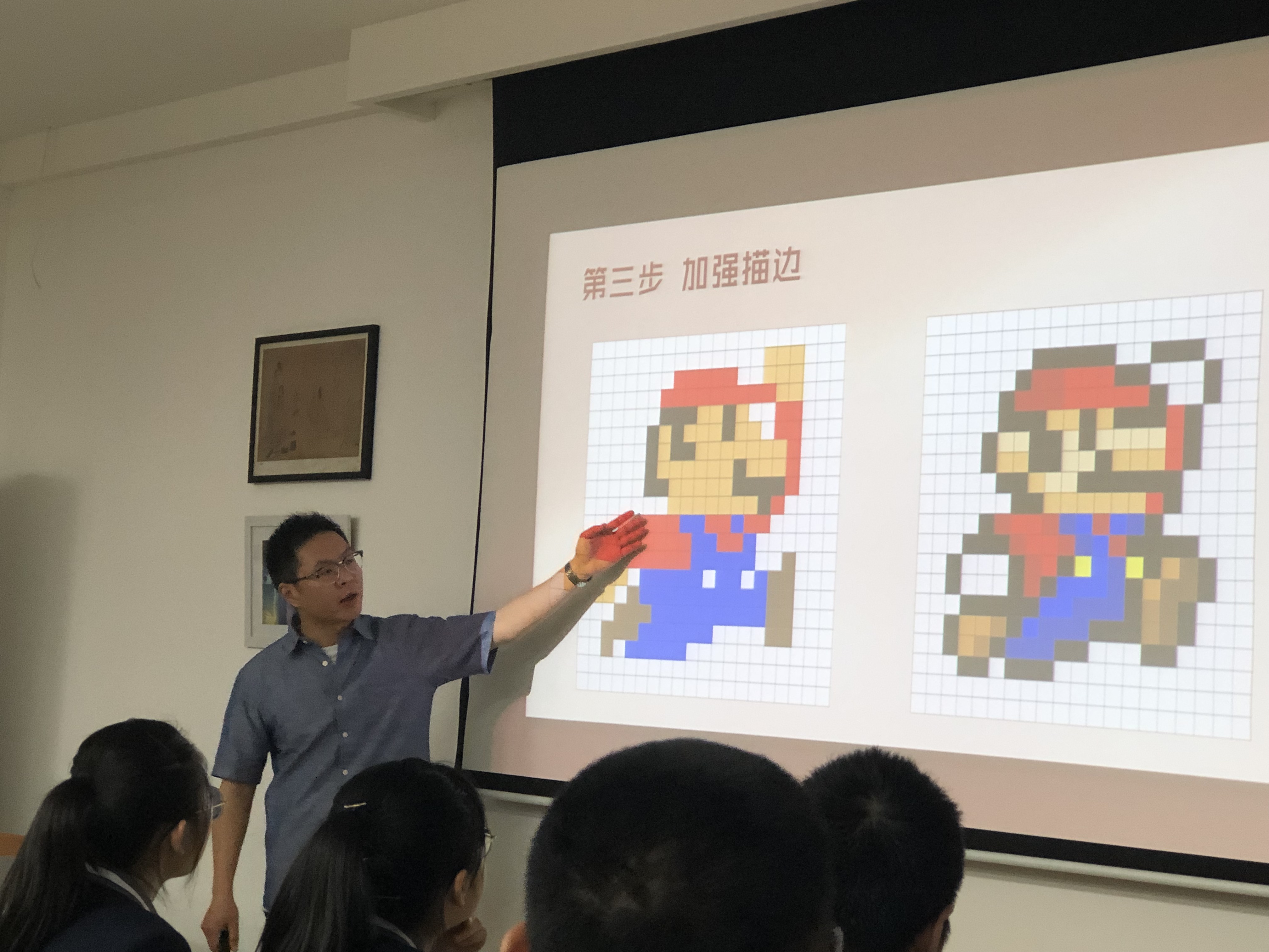二中鄭蒲(pú)港(gǎng)分校(xiào)優秀的美術教師周小舟老師帶來的匯報課的課題是《創意無限——像素畫》。周老師的這節課以美術核(hé)心素養為指導,在設計創新上,為學生們設計了像素繪畫的表現形式(shì)的學習。課堂上周老師(shī)以流行的像素(sù)視覺作品(pǐn)為導入,分析(xī)像素畫的定義特征及創作手法,現場用P S技術向學生示(shì)範(fàn)了如何進行像素化設計,特別(bié)是調動(dòng)學生思考像素塊的構成與繪畫之(zhī)間的巧妙聯係(xì)。多(duō)種示範畫的前後對比效果,讓學生形象的理解像素畫的創作手法,充分調動起學生的積極性。