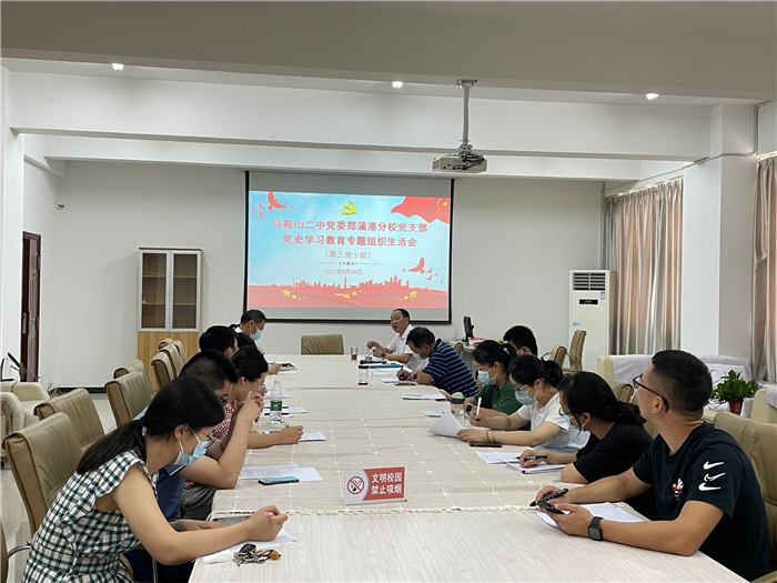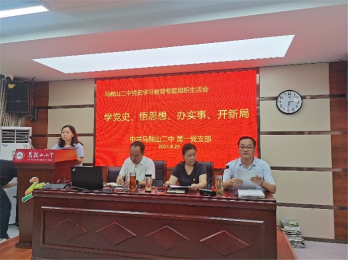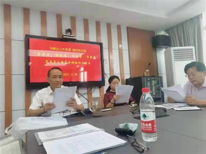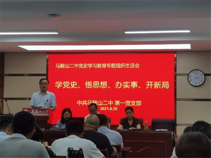 8月29日上午(wǔ),馬鞍山二中黨委第四支部全體黨員在三樓會議室召開了(le)黨史學習教育專題組織生活會(huì)。校黨史學習教育巡回指導組成(chéng)員、工會(huì)主席畢小紅與會(huì)指導。會議首先由校黨委委員、副校長,第四支部書(shū)記慶(qìng)曉代表(biǎo)支部(bù)委員會向黨員作了半年來黨支部工作(zuò)情況的報告,並通報了8月26日支委會上(shàng)檢視的問(wèn)題情況。黨支部副書記朱家讀領學(xué)了習近平總書記在慶祝中國共(gòng)產(chǎn)黨成立100周年大會上的重要講話精(jīng)神和習近平總書(shū)記考察安徽重要講話精神。