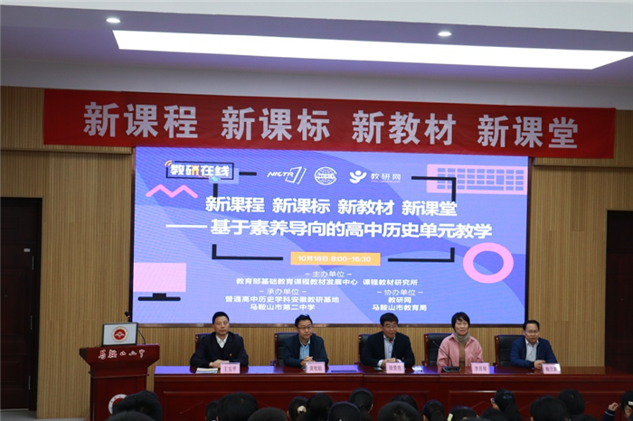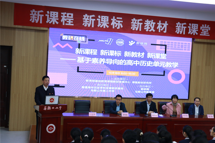 為全麵深化基礎教育課(kè)程改革,落(luò)實立德樹人根本任務,2021年10月18日,由教育部基礎教(jiāo)育課程教材(cái)發(fā)展中心、課程(chéng)教(jiāo)材研究所主辦,教研網、馬鞍山市教育局協辦(bàn),普通高中曆史學科安徽教研基地、馬(mǎ)鞍(ān)山市第二中學承辦的“新課程 新課(kè)標 新(xīn)教材 新課堂——基於素養導向的高(gāo)中(zhōng)曆史單元(yuán)教學”研討交流活動在(zài)我校舉辦,此次活動采用線上線下同時(shí)進行的方式推動教研工(gōng)作轉型發展。校黨委書(shū)記、校長王玉平致歡迎詞(cí)。