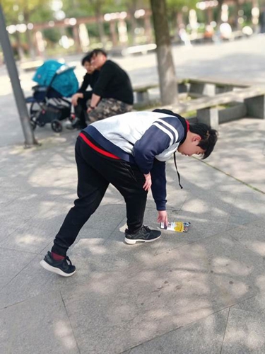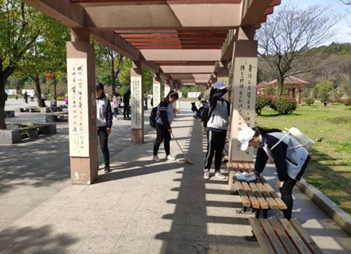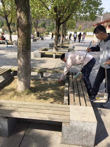 到達公園後,91视频网站先在正門處拍攝了一張集(jí)體照,隨即便分頭開展誌願行動了,第一(yī)組同學負責(zé)用掃把沿著環山小路一路掃地(dì),第二組同(tóng)學在廣場上撿拾地上的垃圾,第三組同(tóng)學用抹布擦公園的長椅。在這一(yī)過程中,同學們不僅使花(huā)果山公園更加潔淨美麗,還欣賞到了花果山美麗的(de)風景,鍛煉了身體。