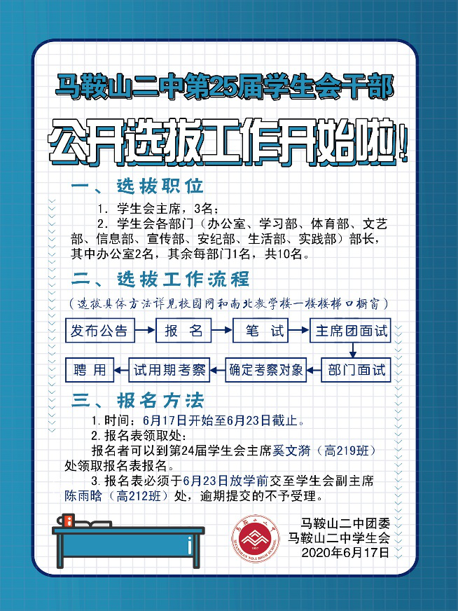 第25屆學生會幹部公開選拔工作共有宣傳報名、筆試和麵試三個階段。6月17日(rì)起,教學樓的海報欄(lán)中,班級的公告欄中,隨處可見馬鞍山二中第25屆學生會幹部公開選拔(bá)的宣傳海報,吸引了每(měi)個路過的同學的目光,學生會承載的神聖責任和執著追求也感召著高一年級的同學(xué)們積極加入。
